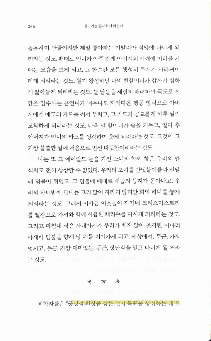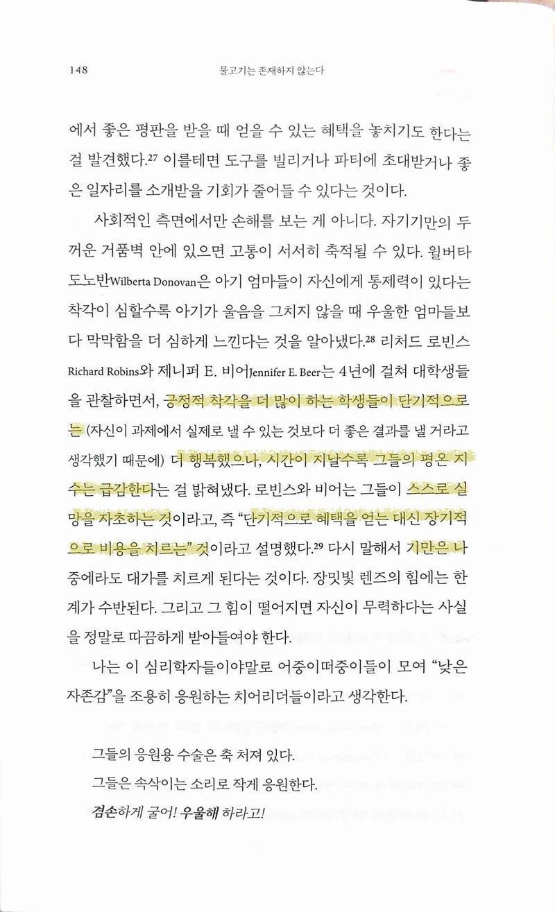 긍정적 착각을 더 많이 하는 학생들이 단기적으로는 (…) 더 행복했으나, 시간이 지날수록 그들의 평온 지수는 급감… 스스로 실망을 자초하는 것… “단기적으로 혜택을 얻는 대신 장기적으로 비용을 치르는” 것… 기만은 나중에라도 대가를 치르게 된다는 것이다. 장밋빛 렌즈의 힘에는 한계가 수반