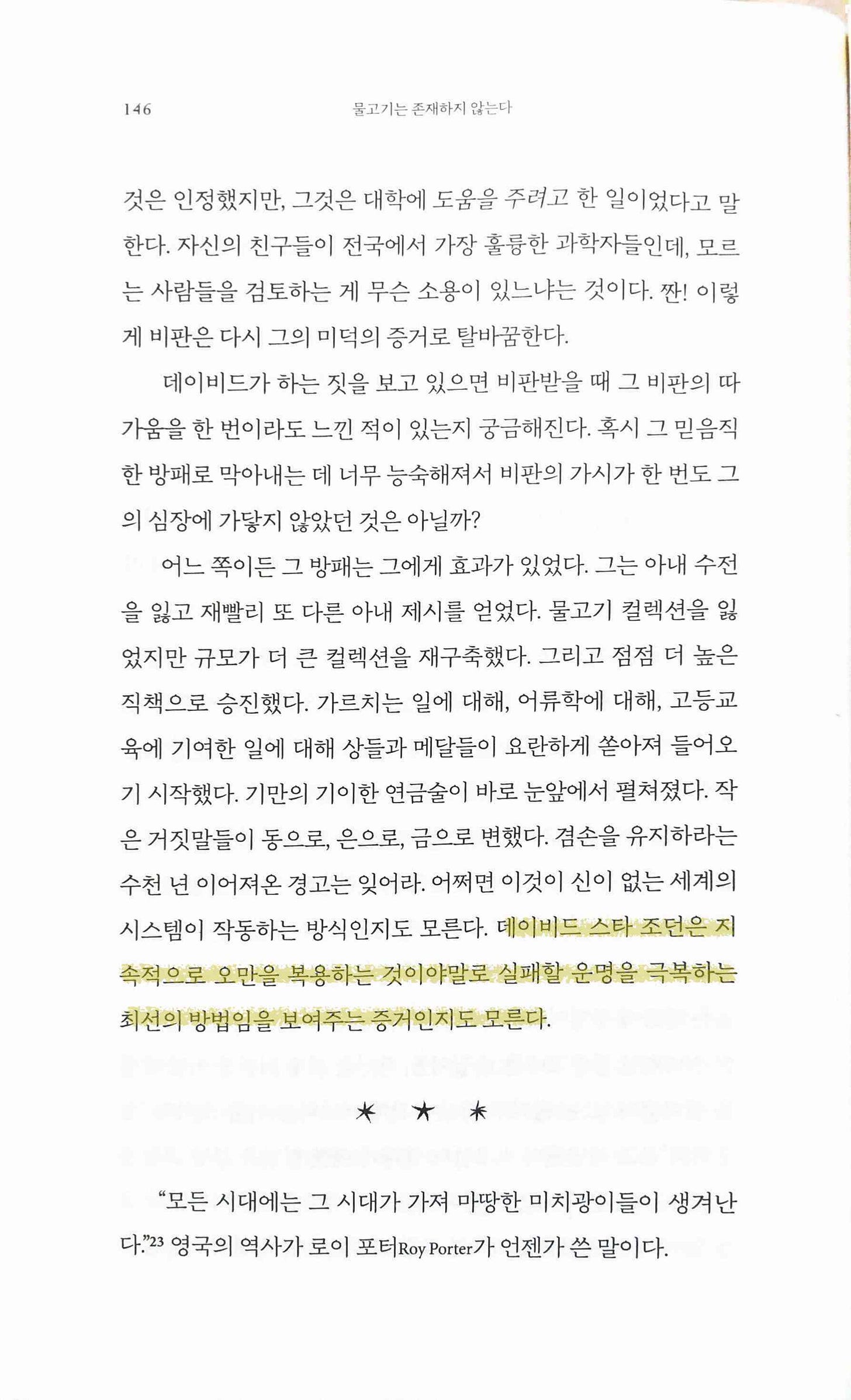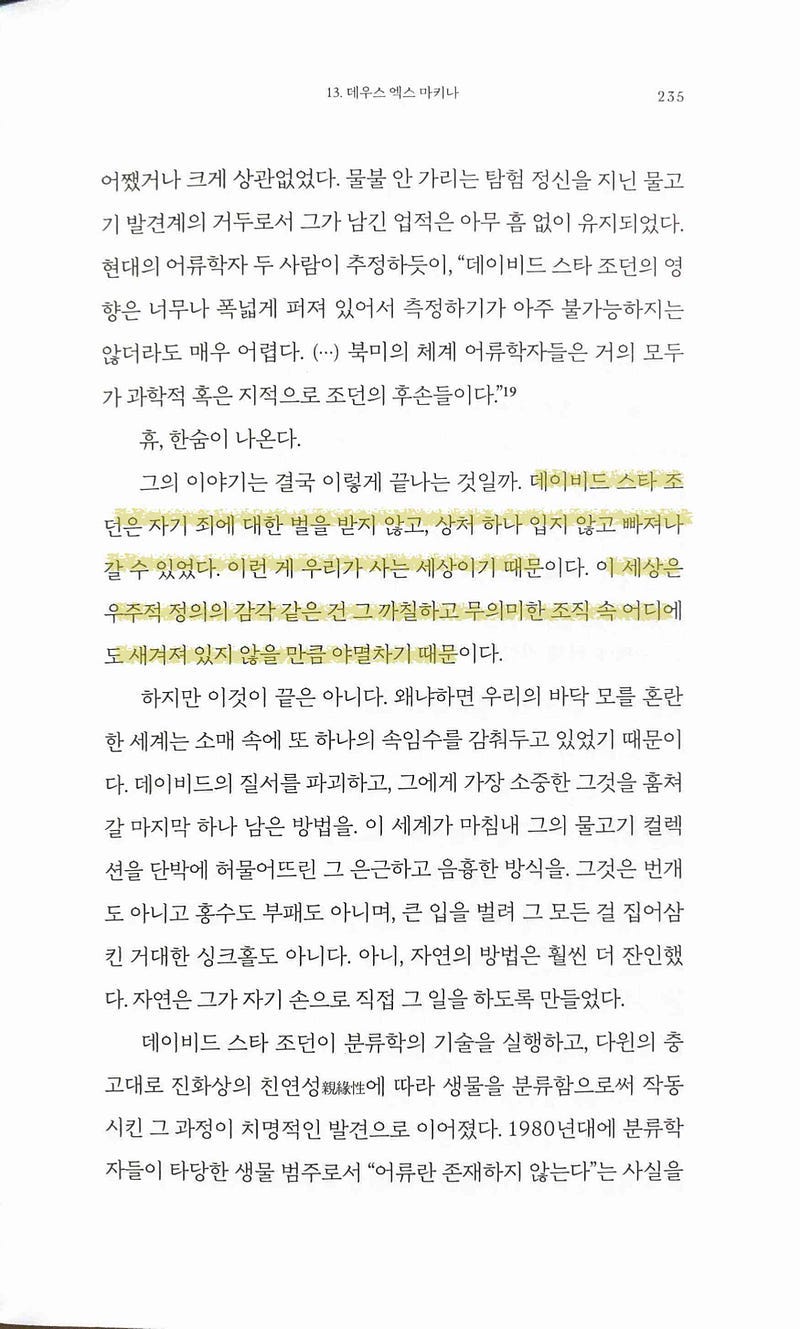 데이비드 스타 조던은 자기 죄에 대한 벌을 받지 않고, 상처 하나 입지 않고 빠져나갈 수 있었다. 이런 게 우리가 사는 세상이기 때문이다. 이 세상은 우주적 정의의 감각 같은 건 그 까칠하고 무의미한 조직 속 어디에도 새겨져 있지 않을 만큼 야멸차기 때문이다.