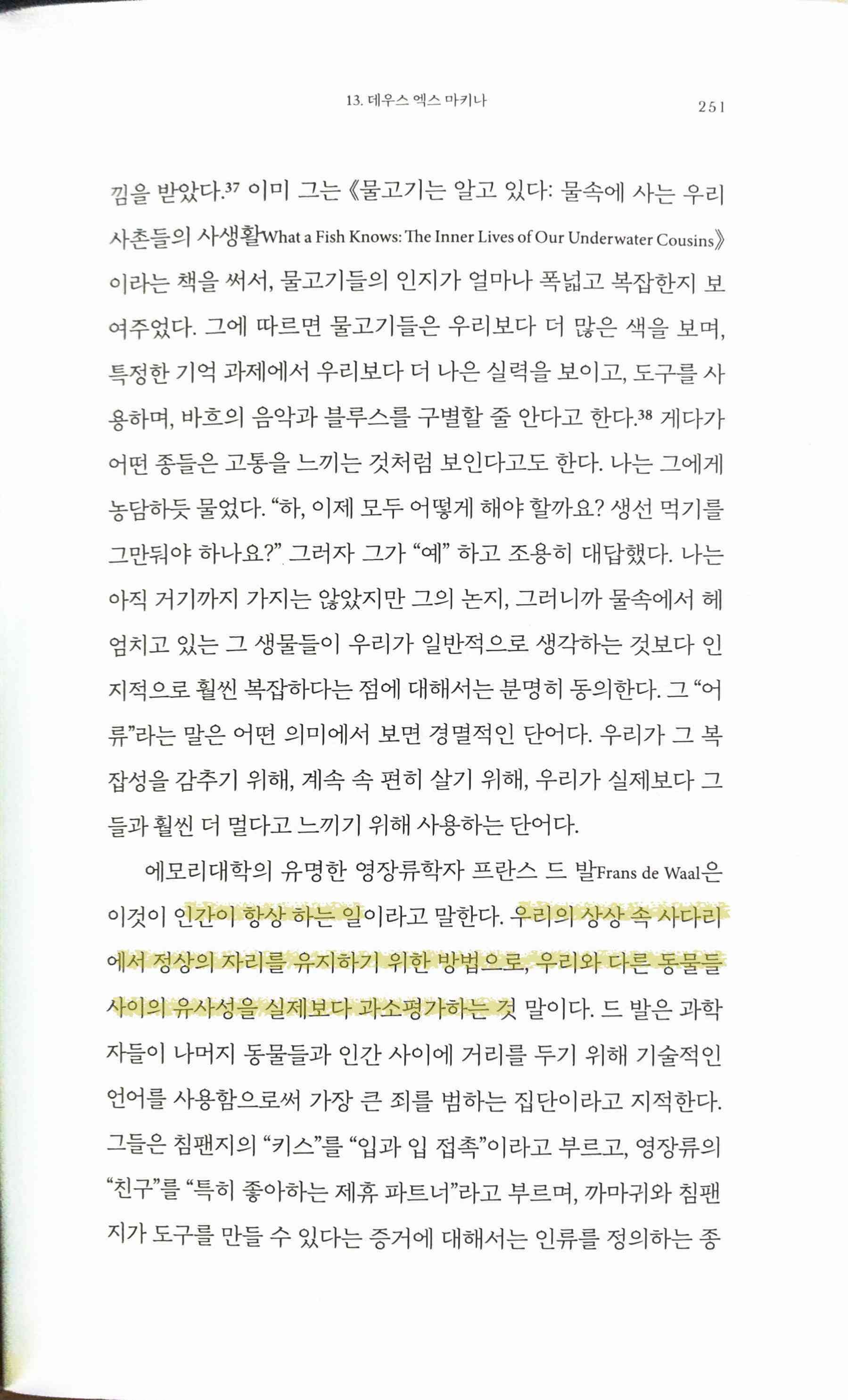 인간이 항상 하는 일… 우리의 상상 속 사다리에서 정상의 자리를 유지하기 위한 방법으로, 우리와 다른 동물들 사이의 유사성을 실제보다 과소평가하는 것
