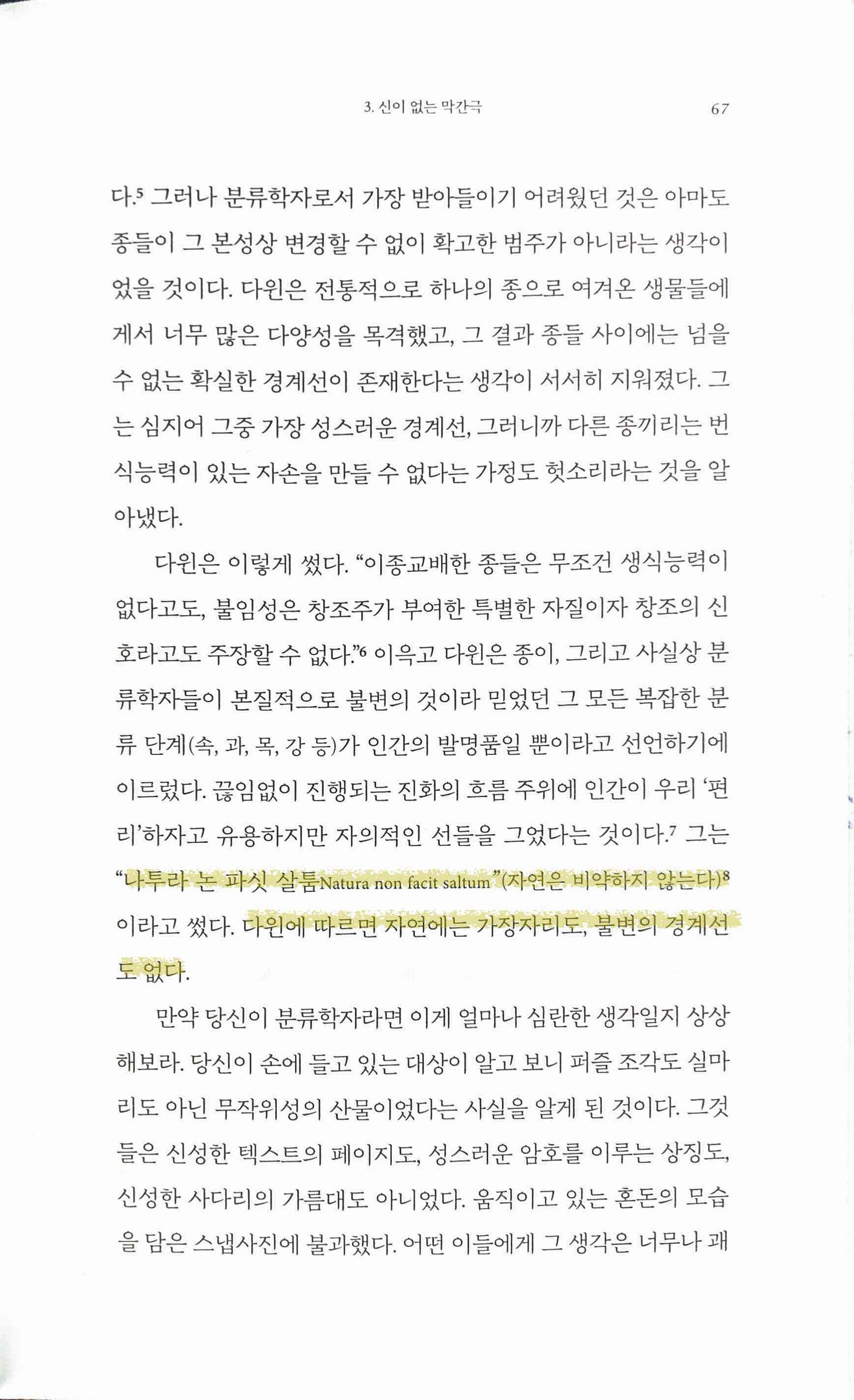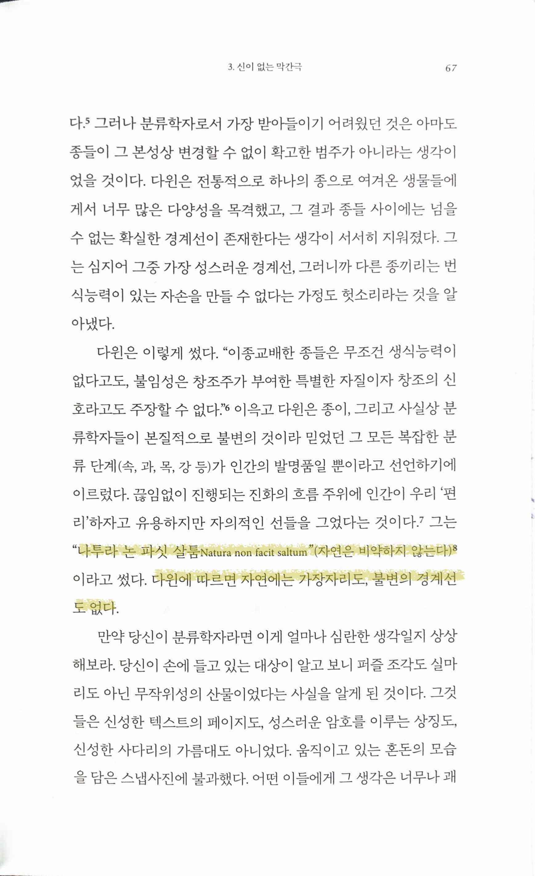 “나투라 논 파싯 살툼 Natura non facit saltum”(자연은 비약하지 않는다)이라고 썼다. 다윈에 따르면 자연에는 가장자리도, 불변의 경계선도 없다.