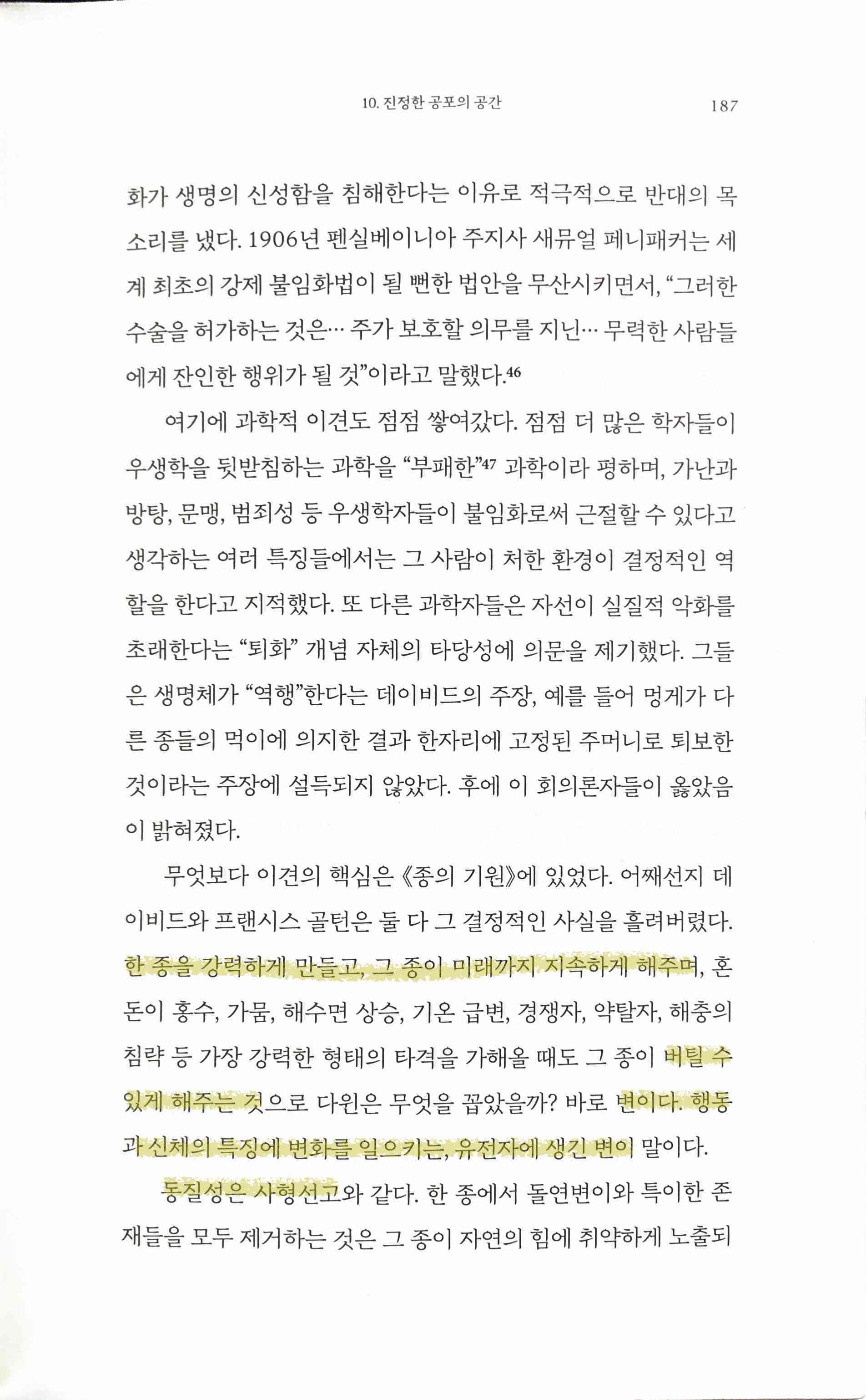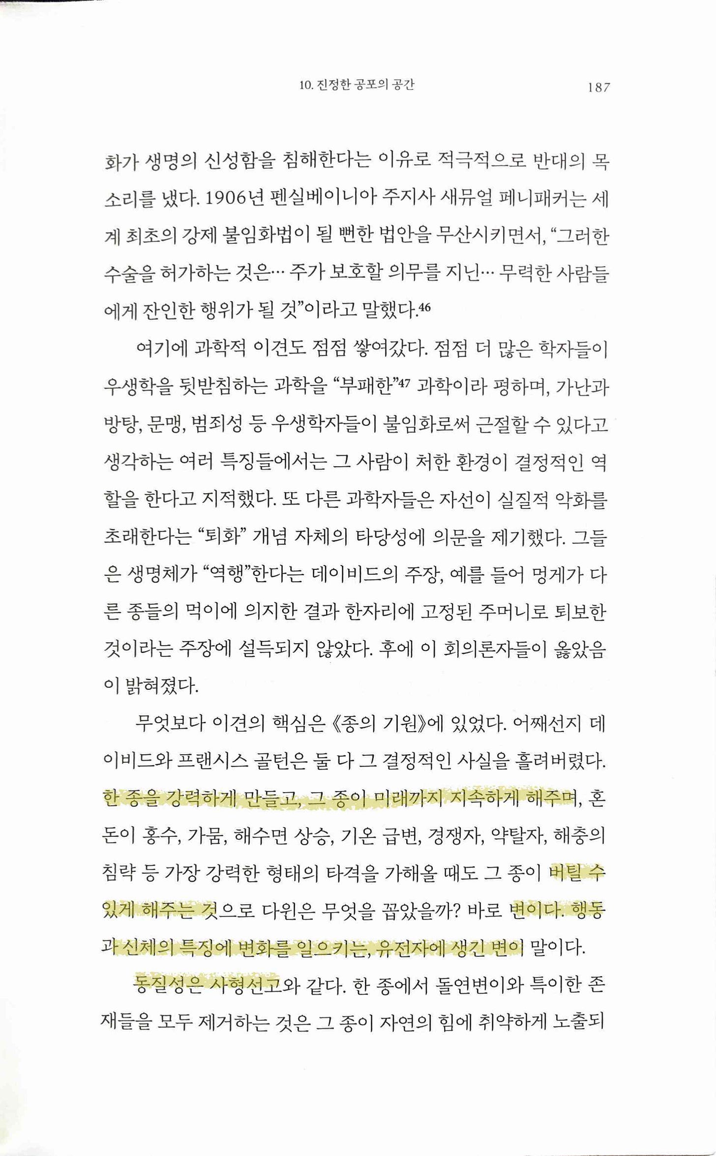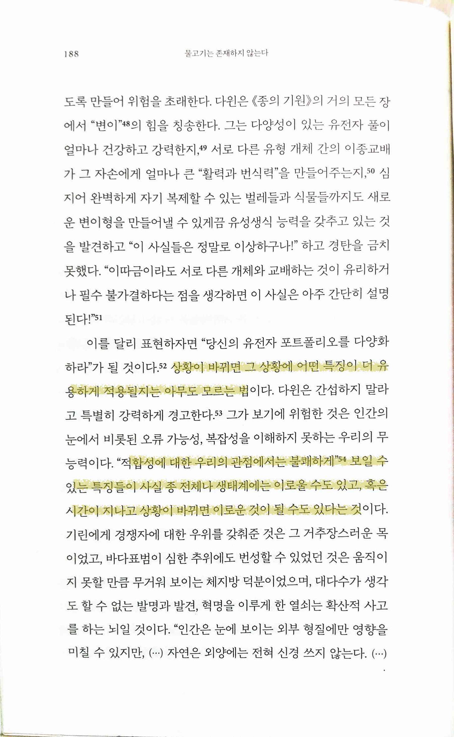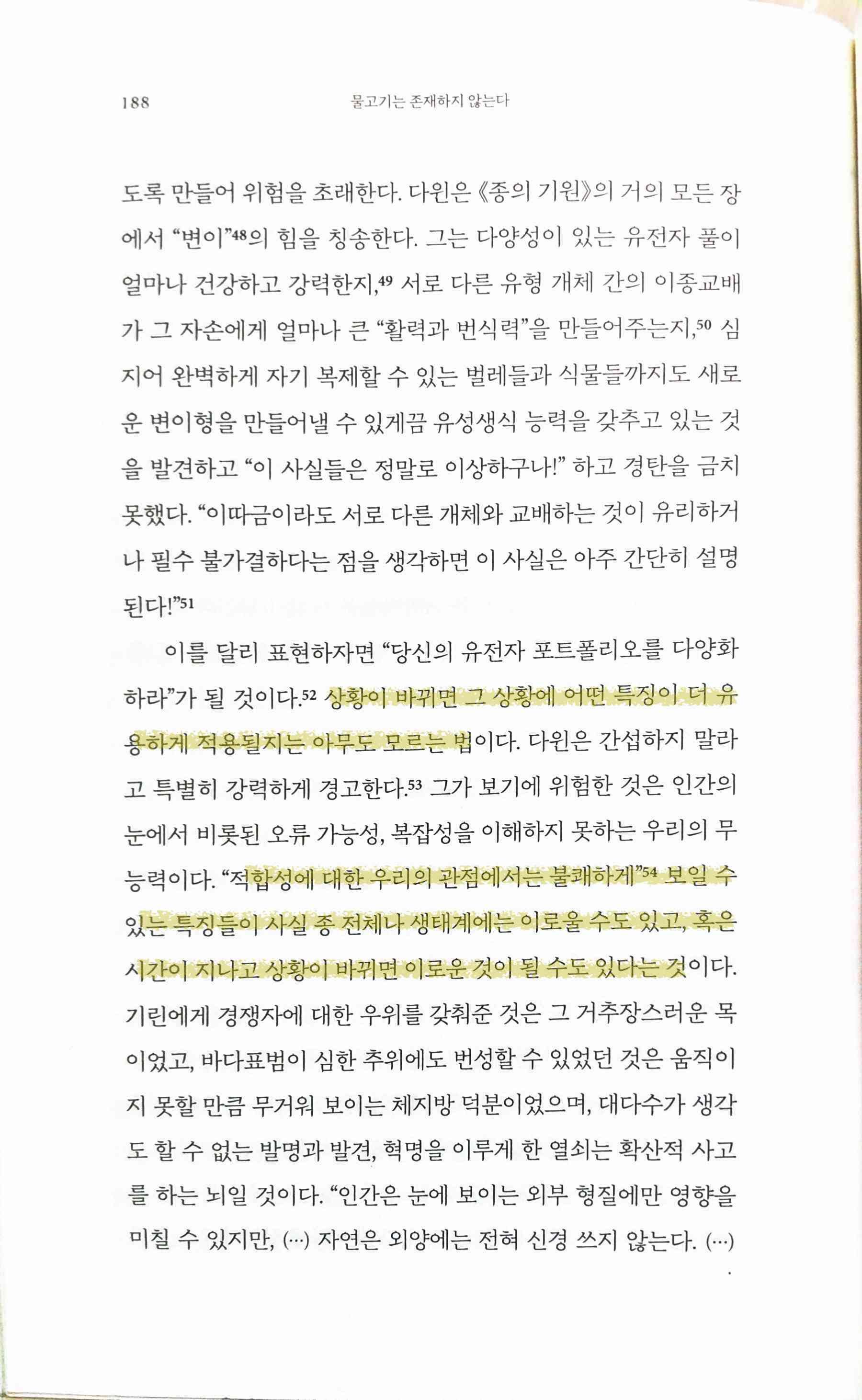 한 종을 강력하게 만들고, 그 종이 미래까지 지속하게 해주며, … 버틸 수있게 해주는 것… 변이다. 행동과 신체의 특징에 변화를 일으키는, 유전자에 생긴 변이