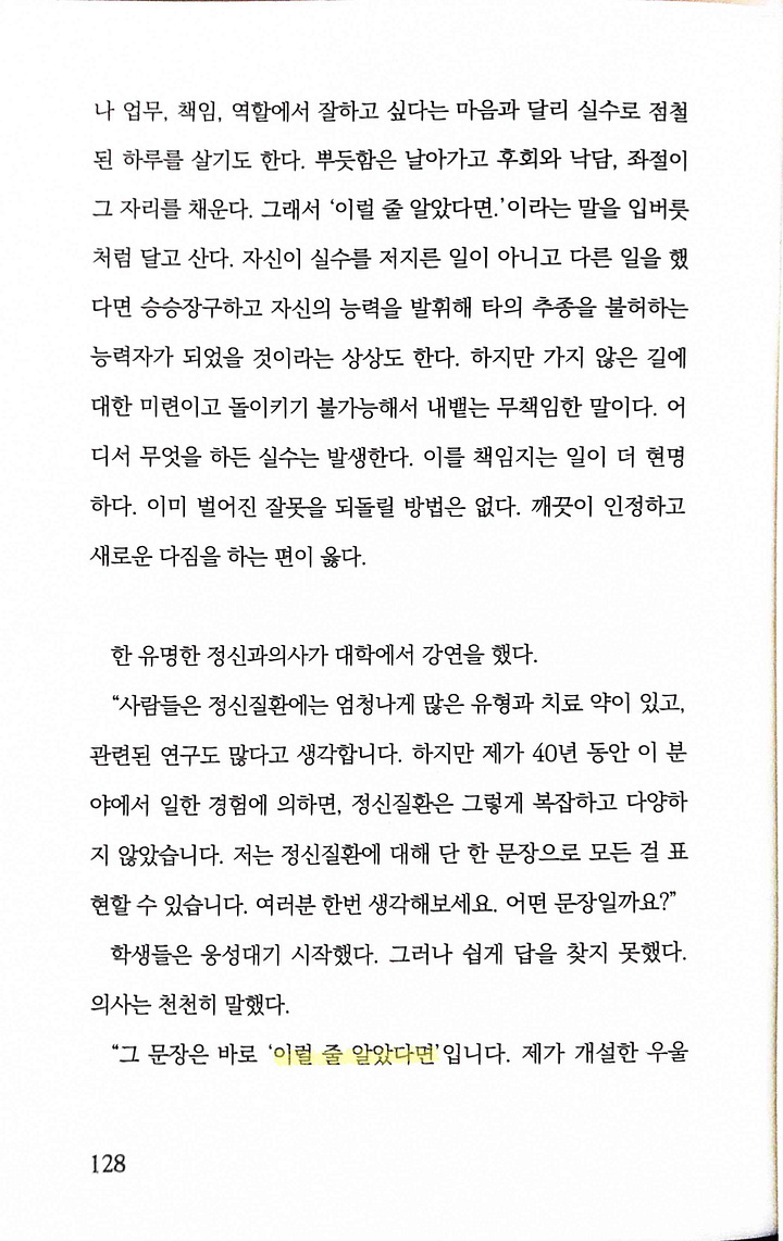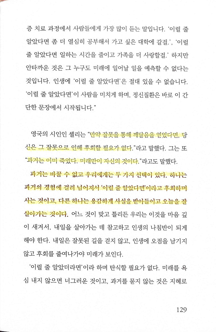 과거는 바꿀 수 없고 우리에게는 두 가지 선택이 있다. 하나는 과거의 경험에 걸려 넘어져서 ‘이럴 줄 알았다면’이라고 후회하며 사는 것이고, 다른 하나는 용감하게 사실을 받아들이고 오늘을 잘 살아가는 것이다