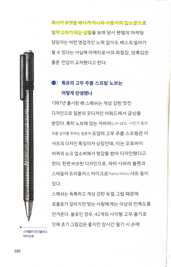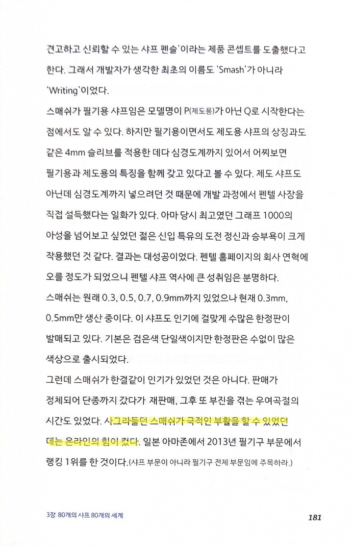 ★★★☆☆ November 11, 2024 진정한 덕후가 쓴 샤프에 대한 책. 존경스럽단 마음이 절로 든다. 샤프라는 흔한 commodity에 대해 이렇게까지 분석을 하고 책을 쓸 수 있다는 게 성취를 잘 보여주는 예라는 생각이 든다. 아무 생각없이 값 싸게 사용하던 도구의 내부가 이렇게 정밀하고 다양하게 구현되었다는 게 놀랍고 대단하다.