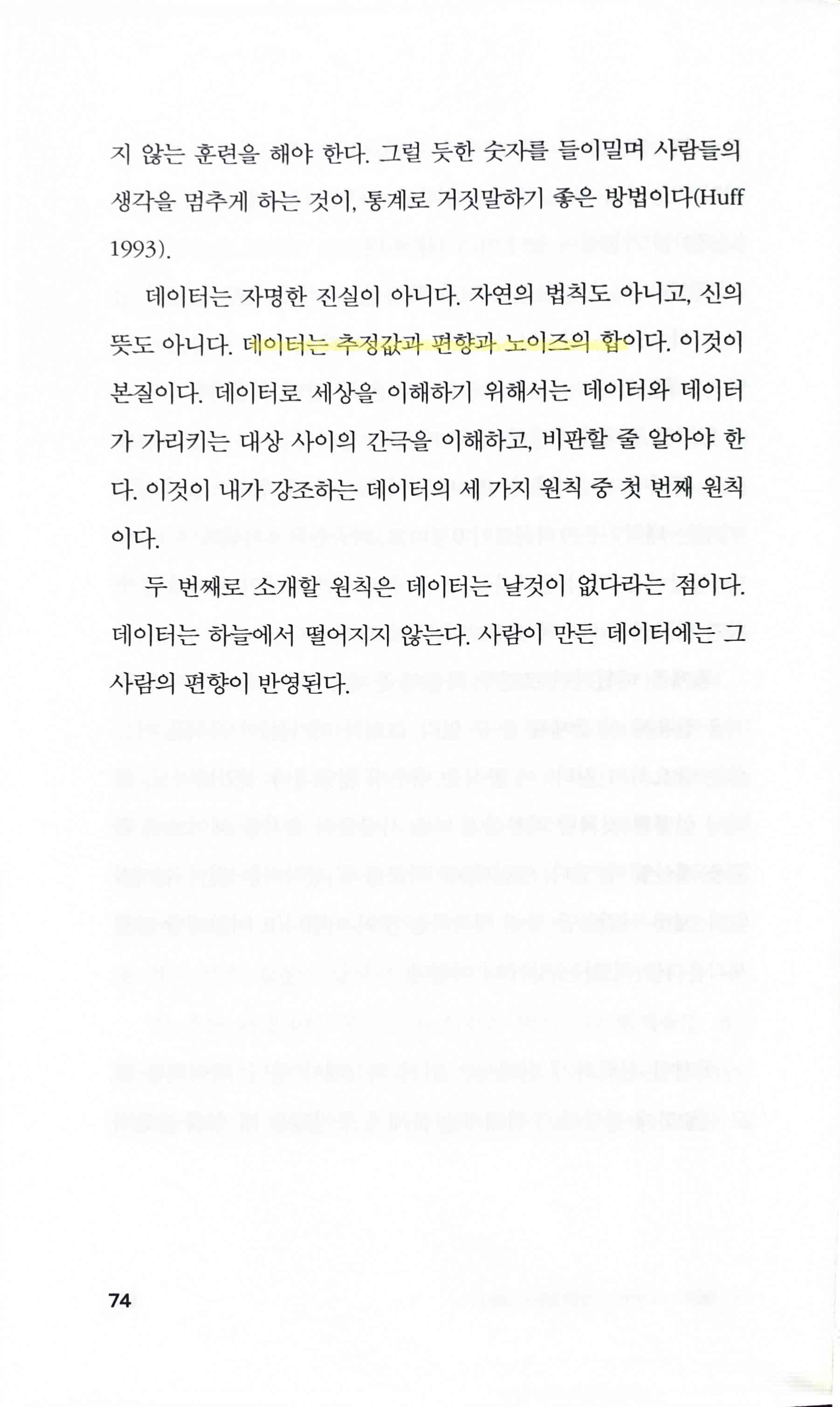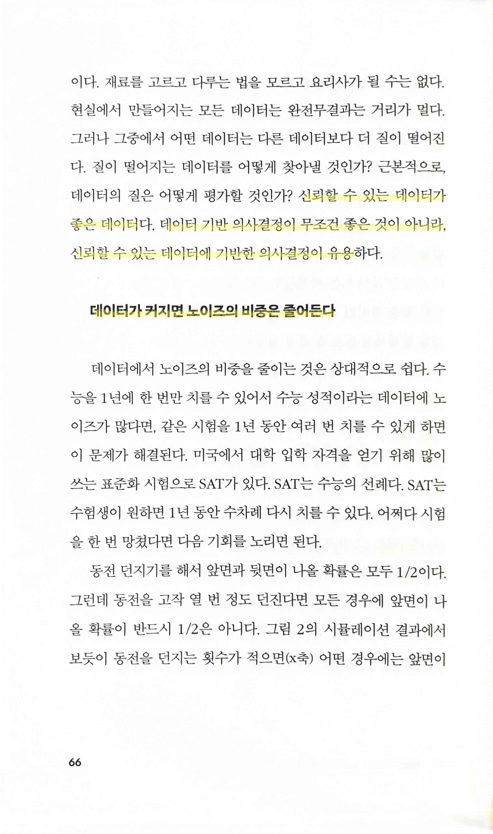 신뢰할 수 있는 데이터의 중요성. 결국 데이터 수집 및 가공의 단계부터가 중요하고, 대부분의 책에서도 실무에서는 이 단계가 사실상 성공과 실패를 가르는 가장 큰 요인이라고 이야기한다.데이터가 커지면 노이즈의 비중은 줄어든다야구가 다른 스포츠보다 sabremetrics가 먼저 발달하고 영향력이 클 수 밖에 없는 이유. 경기 수도 가장 많은 데다가 모든 플레이를 끊어서 공 하나마다 분석 할 수 있기 때문에 다른 종목에 비해 압도적으로 통계의 영향력이 크다. 그로 인한 반대 급부로 야구가 재미없어 진다는 일종의 자성(?)의 목소리도 나오기도 하고.