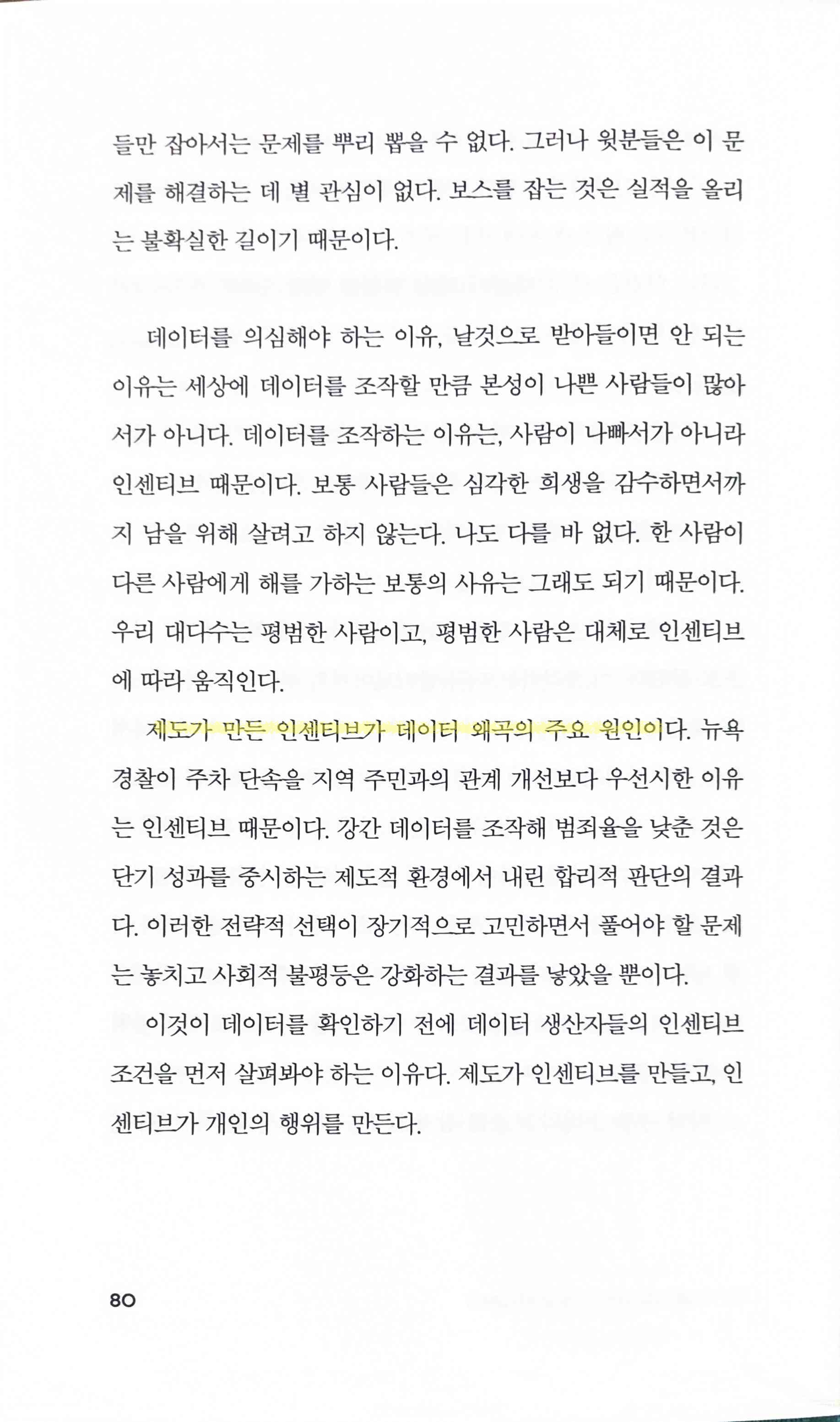 제도가 만든 인센티브가 데이터 왜곡의 주요 원인데이터 왜곡만이 아니다. 사람들의 행동 자체에 영향을 준다. 가장 대표적인 게 우리나라 주택 정책. 어떤 제도를 만들어도 투기업자들은 언제나 틈을 찾아 버블을 만들어 내려고 하고, 어떤 사람들은 집값 부양을 위해 보통 사람들은 생각지도 못할 행동을 실행한다.