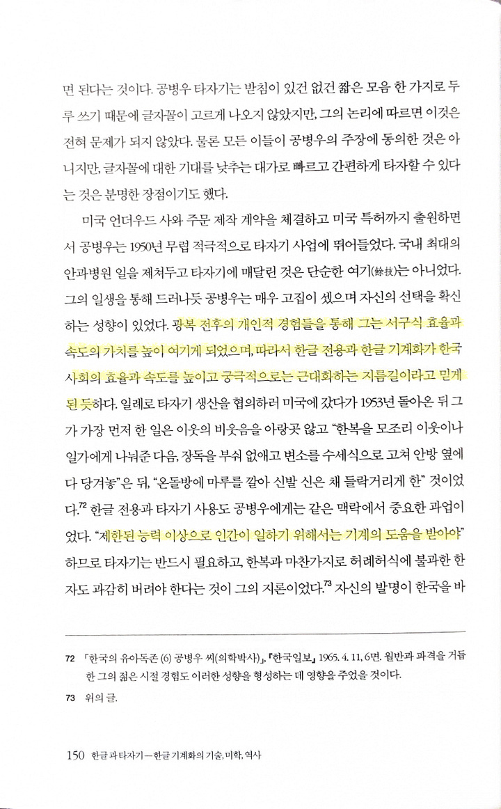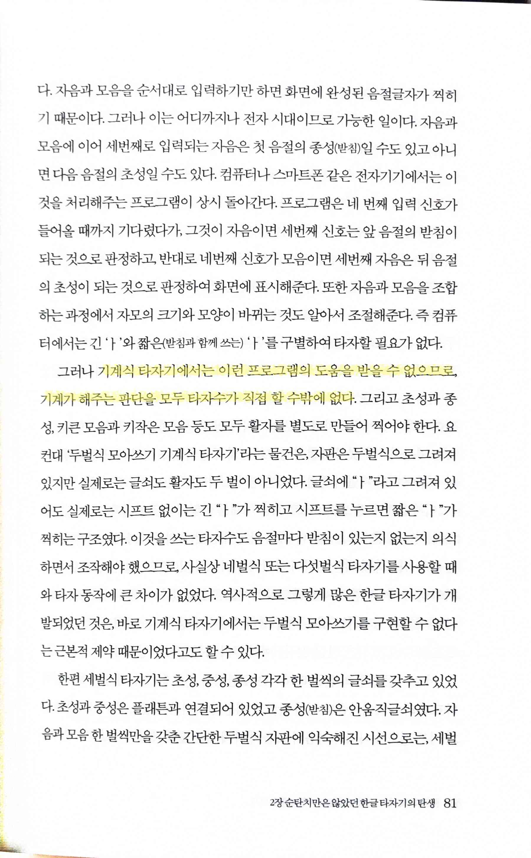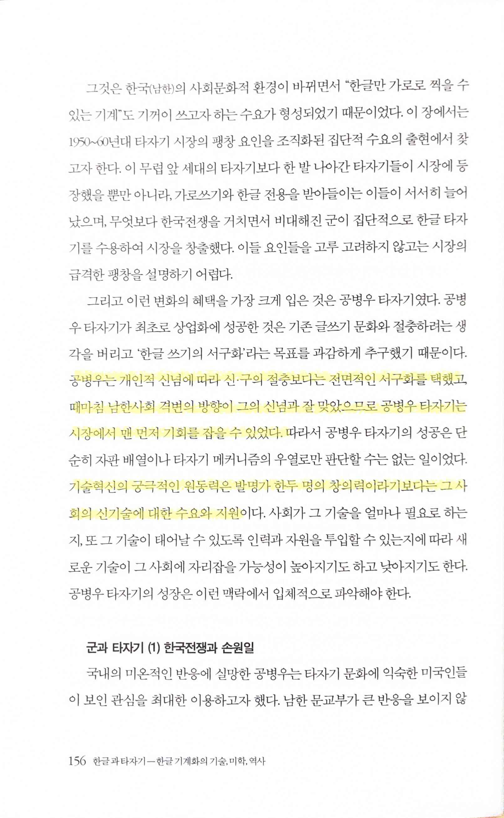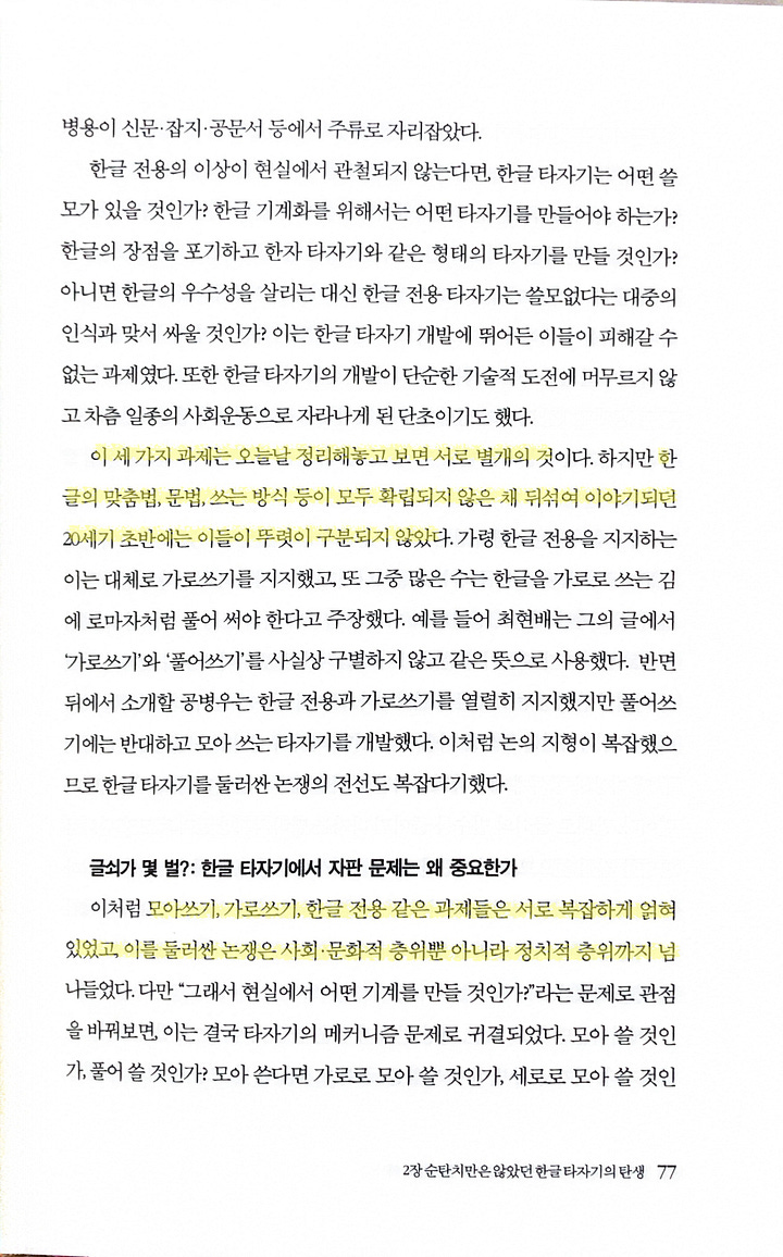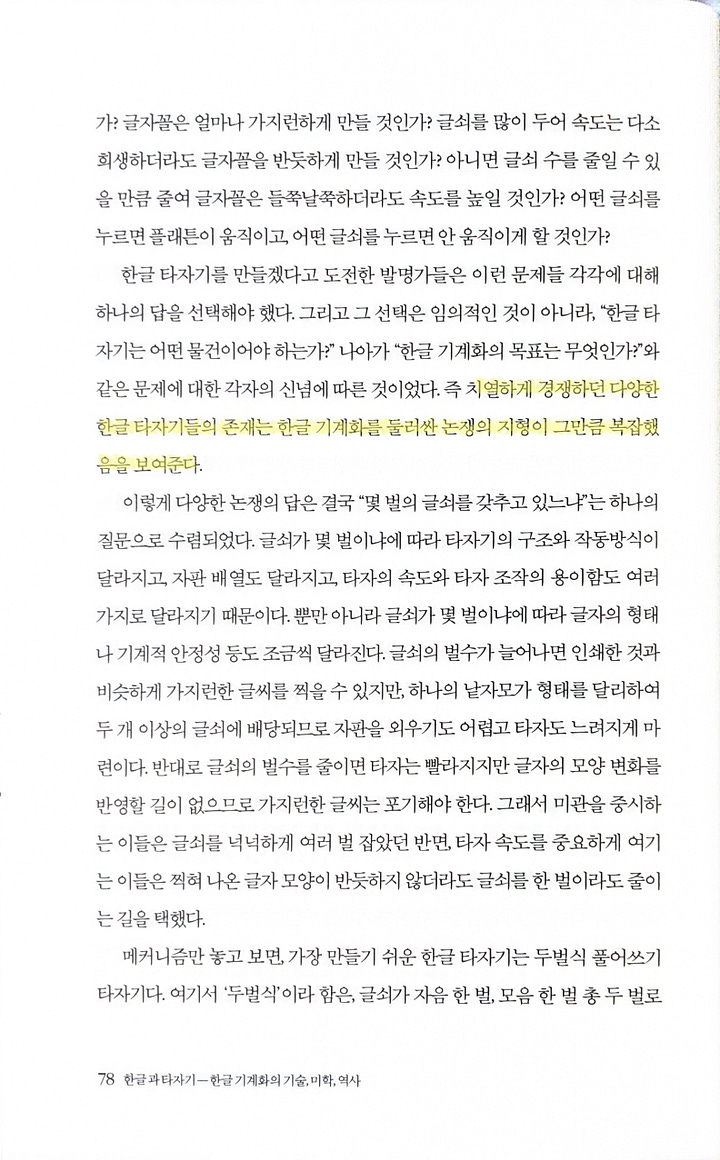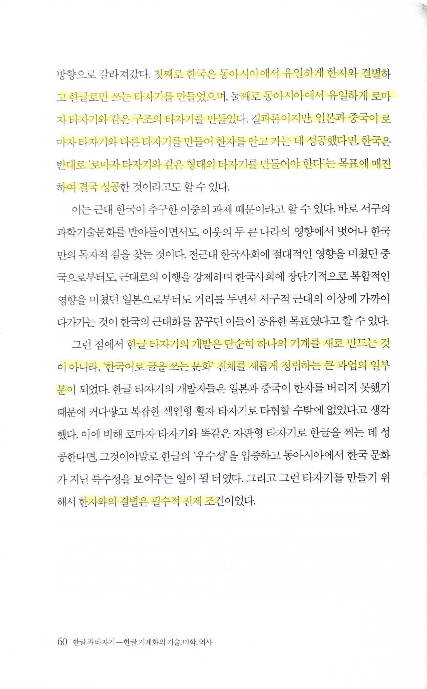 한글 타자기의 개발은 현실적 수요에 부응할 뿐 아니라 “가장 과학적인 문자”라는 한글에 대한 자부심과 기대를 충족시켜야 한다는 당위를 저버릴 수 없었기에 그만큼 더 어려운 과정… 한글 기계화란 실상 한글의 쓰기 문화를 서구화하는 과정