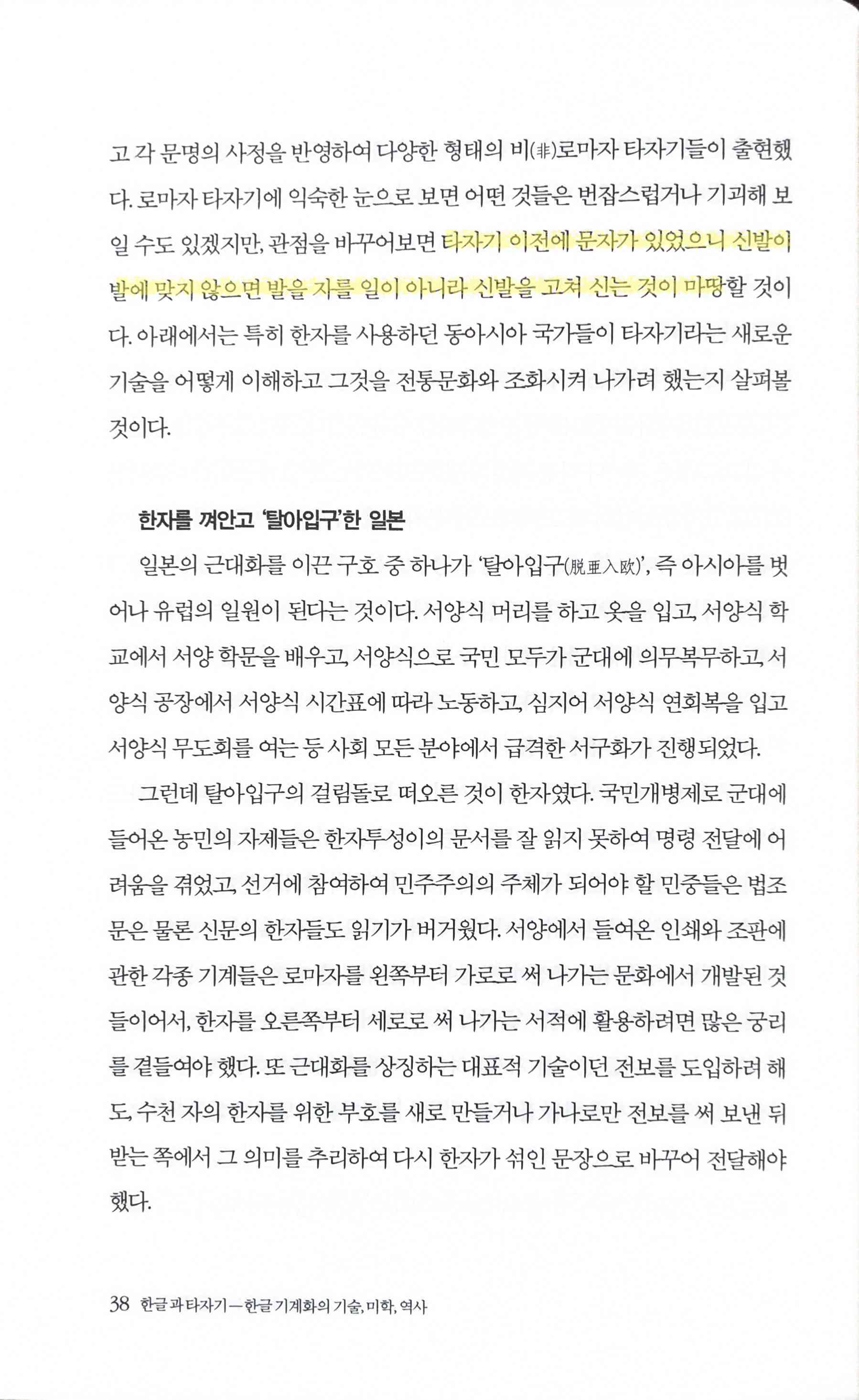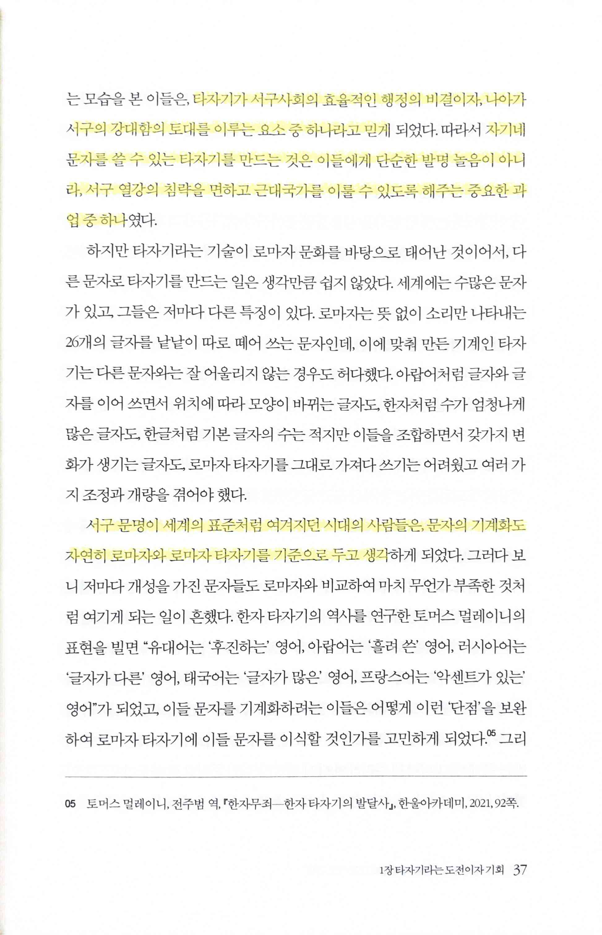 타자기가 서구사회의 효율적인 행정의 비결이자, 나아가 서구의 강대함의 토대를 이루는 요소 중 하나라고 믿게… 자기네 문자를 쓸 수 있는 타자기를 만드는 것은 이들에게 단순한 발명 놀음이 아니라, 서구 열강의 침략을 면하고 근대국가를 이룰 수 있도록 해주는 중요한 과업 중 하나