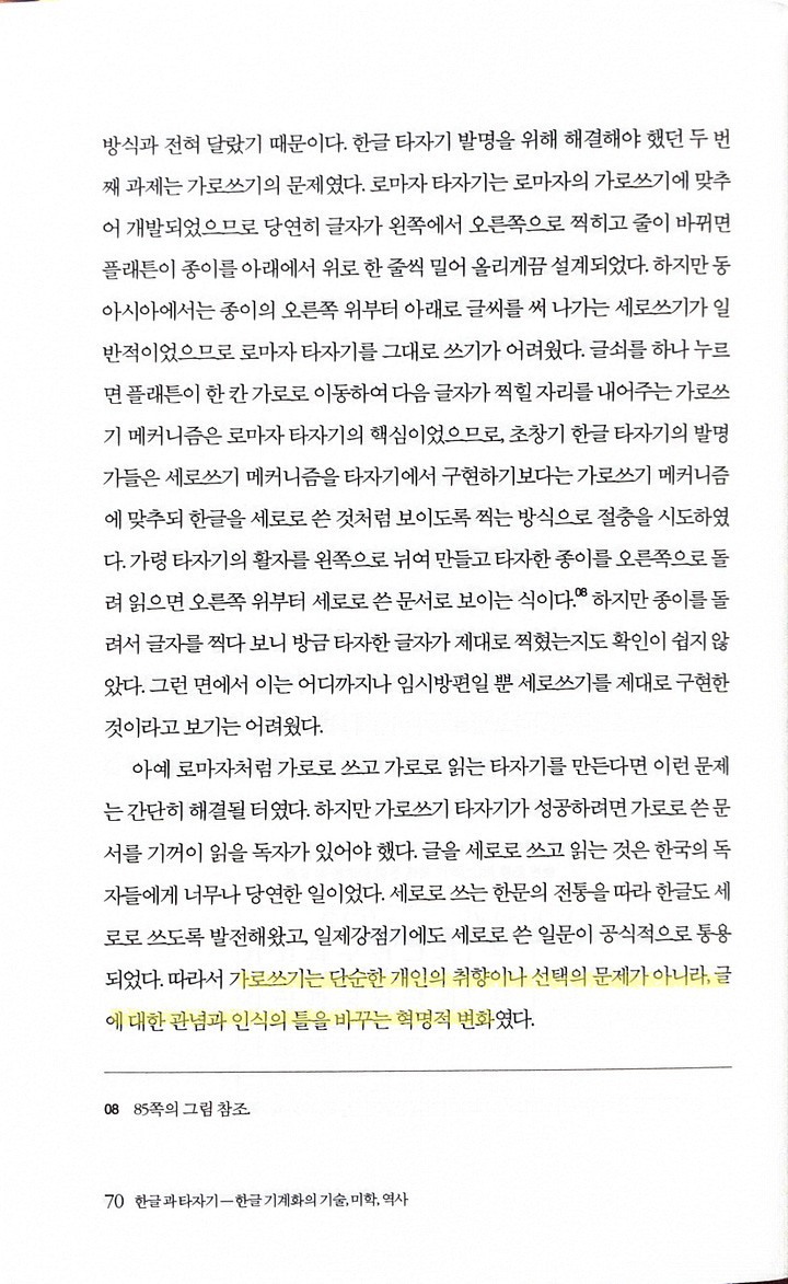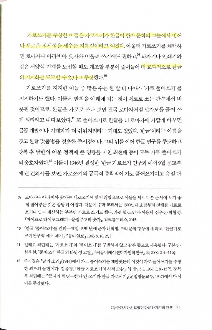가로쓰기를 주창한 이들은 가로쓰기가 한글이 한자 문화의 그늘에서 벗어나 새로운 정체성을 세우는 지름길이라고 여겼다… 더 효과적으로 한글의 기계화를 도모할 수 있다고 주장
