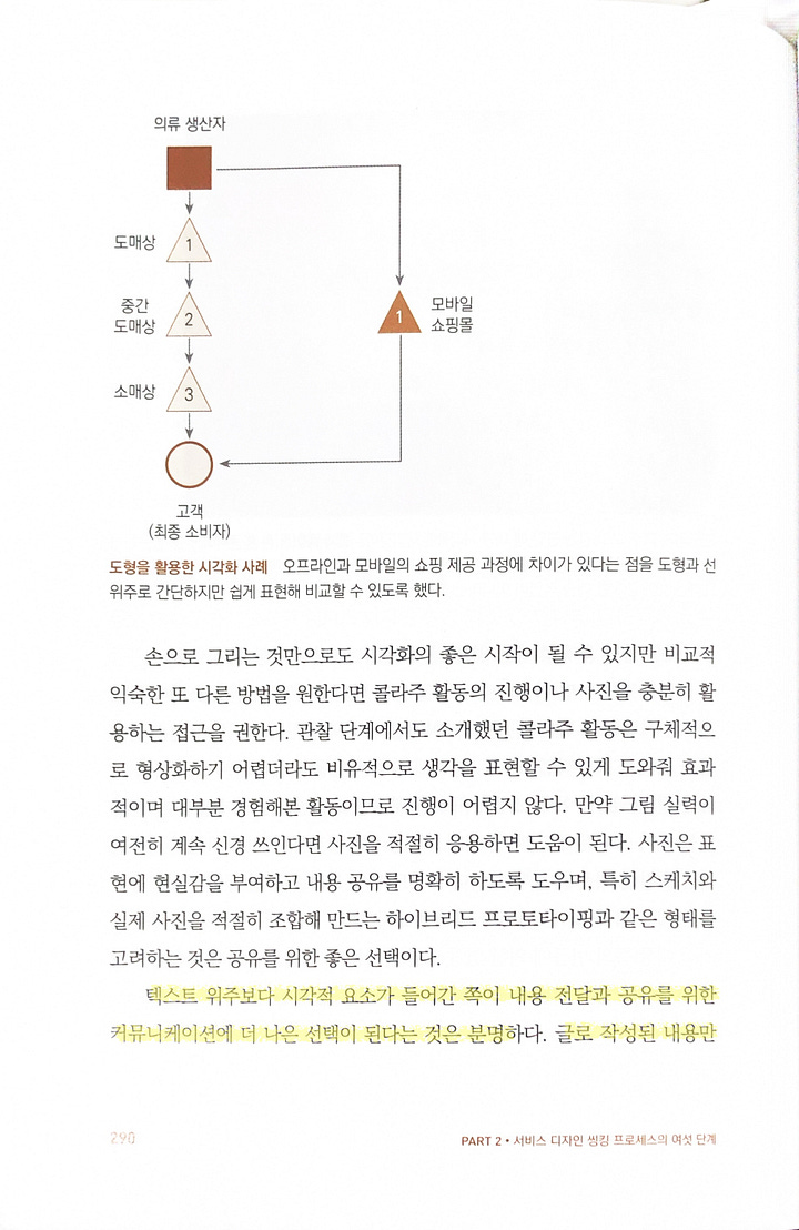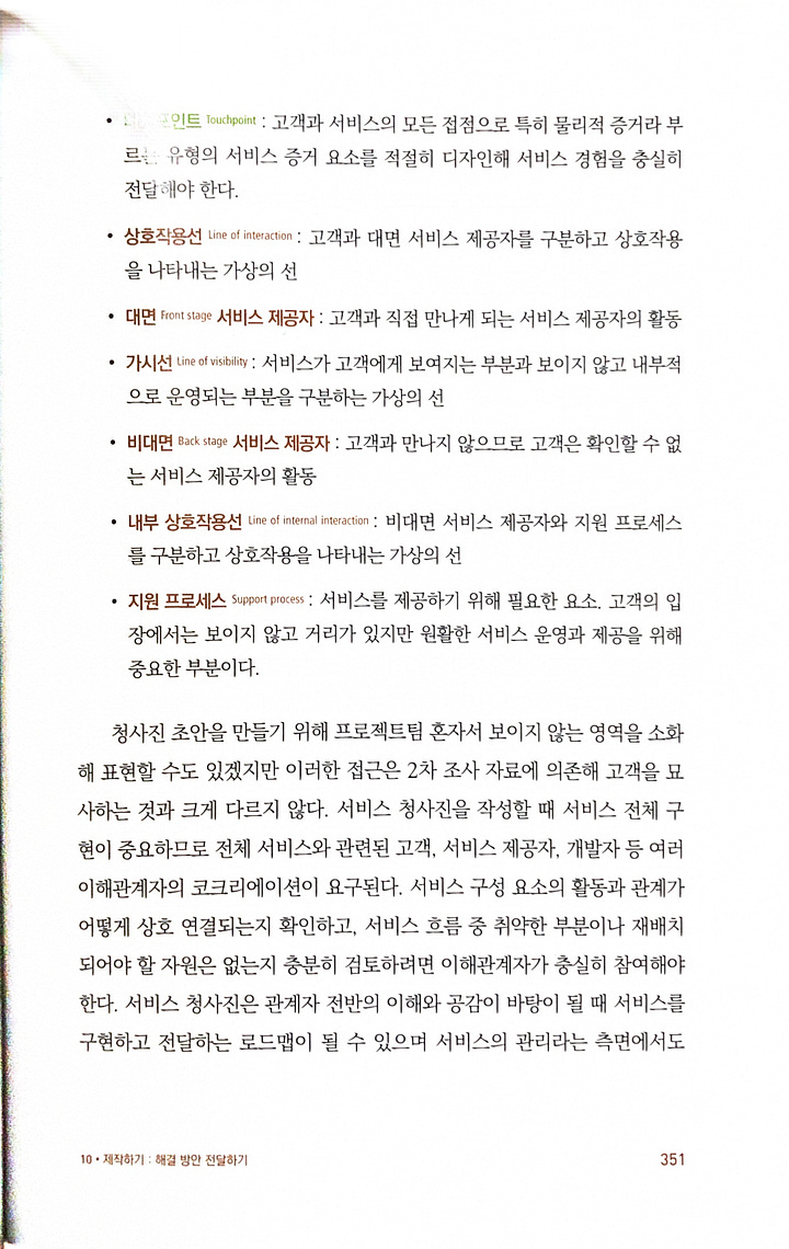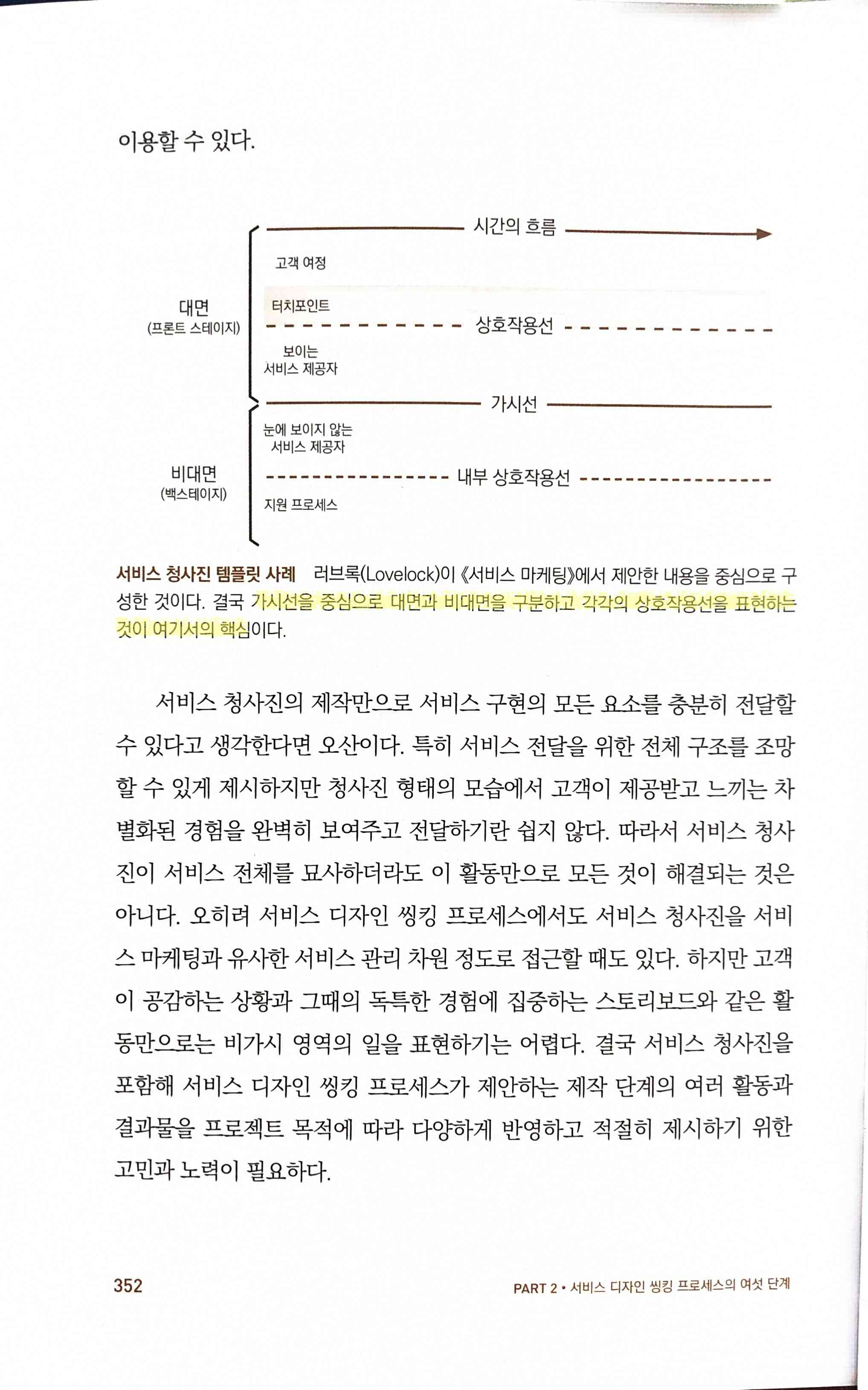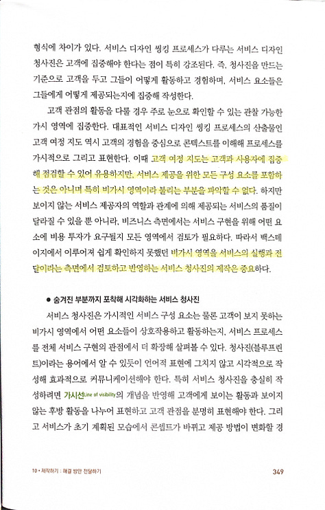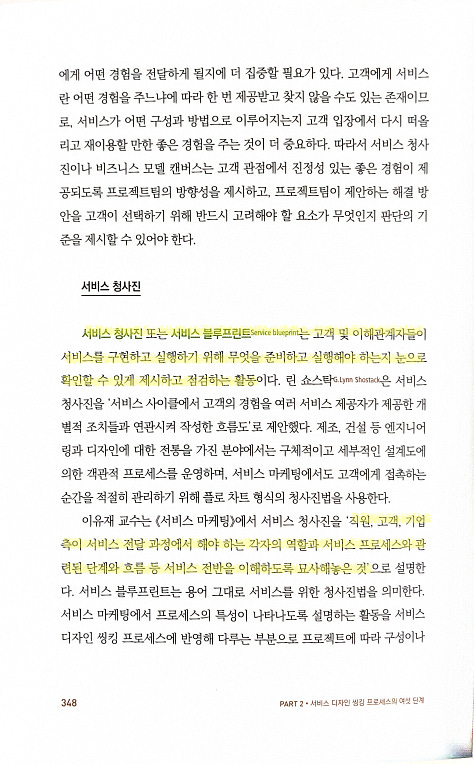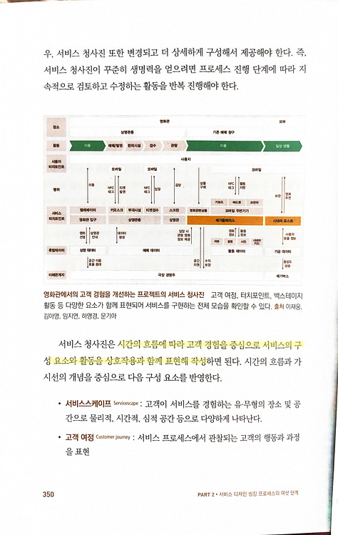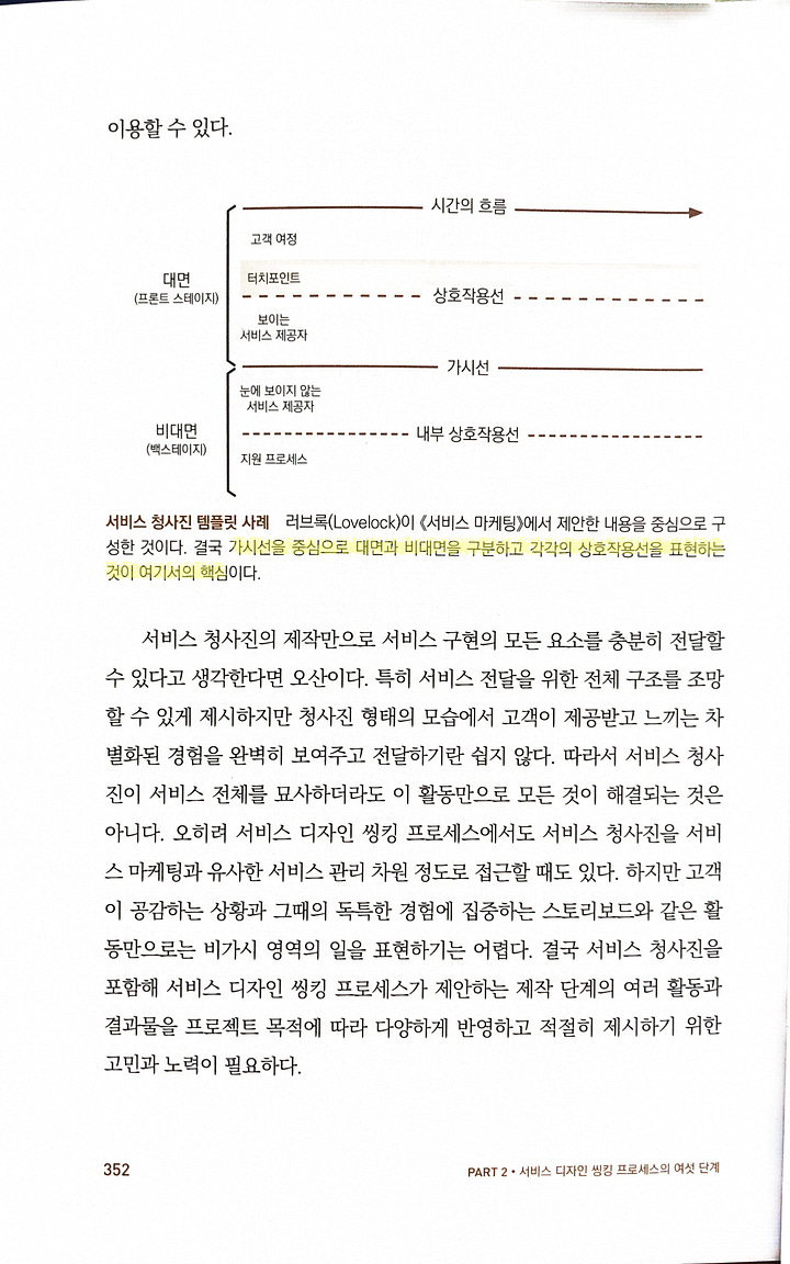 고객 및 이해관계자들이 서비스를 구현하고 실행하기 위해 무엇을 준비하고 실행해야 하는지 눈으로 확인할 수 있게 제시하고 점검하는 활동직원, 고객, 기업 측이 서비스 전달 과정에서 해야 하는 각자의 역할과 서비스 프로세스와 관련된 단계와 흐름 등 서비스 전반을 이해하도록 묘사해놓은 것고객 여정 지도는 고객과 사용자에 집중해 점검할 수 있어 유용하지만, 서비스 제공을 위한 모든 구성 요소를 포함하는 것은 아니며 특히 비가시 영역이라 불리는 부분을 파악할 수 없다비가시 영역을 서비스의 실행과 전달이라는 측면에서 검토하고 반영하는 서비스 청사진의 제작은 중요architecture diagram이나 business flow diagram을 그려도 실제로 업무에 대해 확인을 같이 하다보면 비가시 영역, 즉 표현되지 않거나 못하는 부분을 만나는 일이 종종 생기기 때문에 이런 부분까지 포함해서 표현하는 건 정말 중요