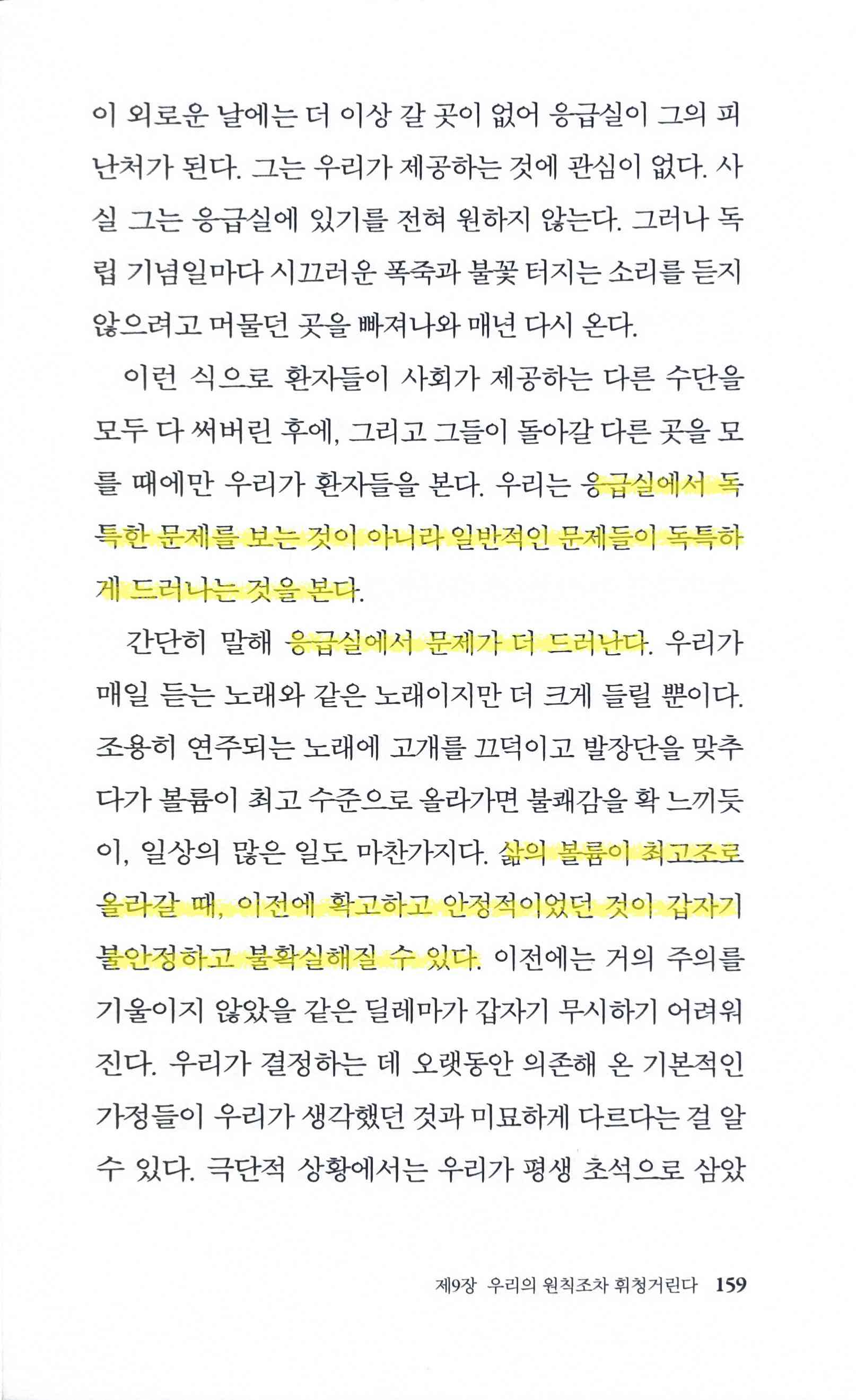 저자가 강조하듯 응급실은 결코 독특한 문제가 발생하는 장소가 아니다. 오히려 일반적인 문제들이 독특하게 드러나는데, 이를 받아들이는 태도는 각자의 정신적 모델에 따라 다양하다. 그래서 정답은 존재하지 않는다. ‘아는 것이 힘이다’와 ‘무지는 축복이다’ 사이의 희미한 경계 위에서 인생은 해결되지 않는 딜레마와 답 없는 질문들로 가득 차 있다. 그럴 때일수록 저자는 불편한 경험과 불확실성을 있는 그대로 받아들이고(즐기라고 권한다), 삶의 속도를 잠시 늦춰 일상을 면밀히 들여다보라고 권한다. 이러한 권고는 우리가 삶을 단단히 지탱할 수 있게 해 주는 한 가지 좋은 자세를 알려준다.
