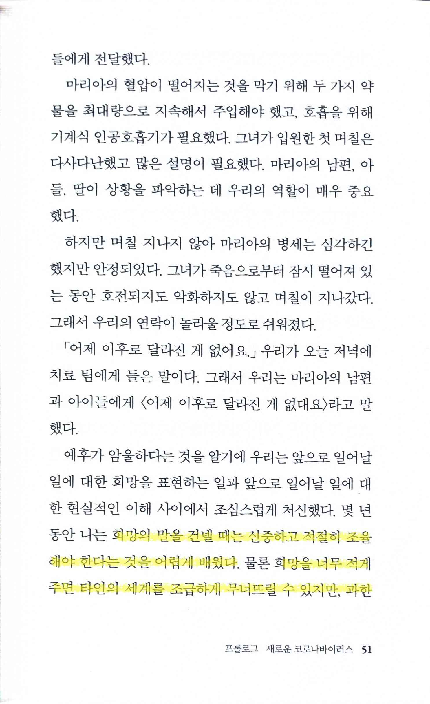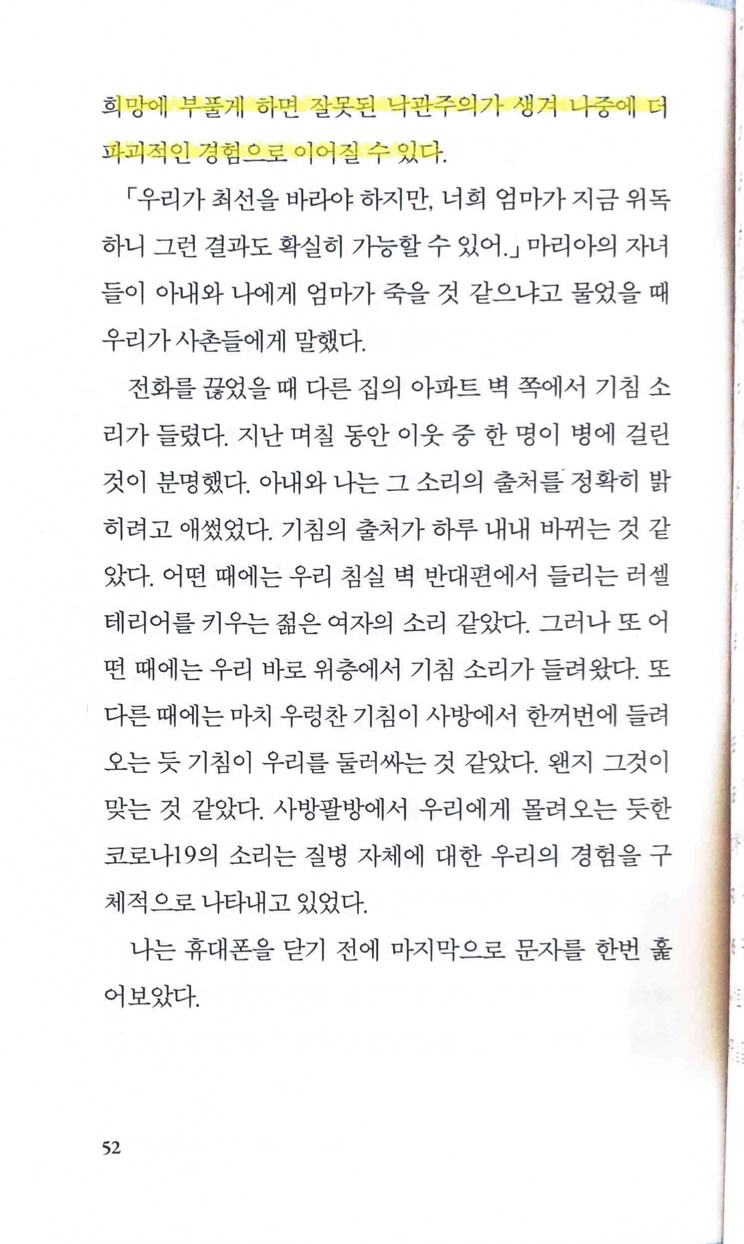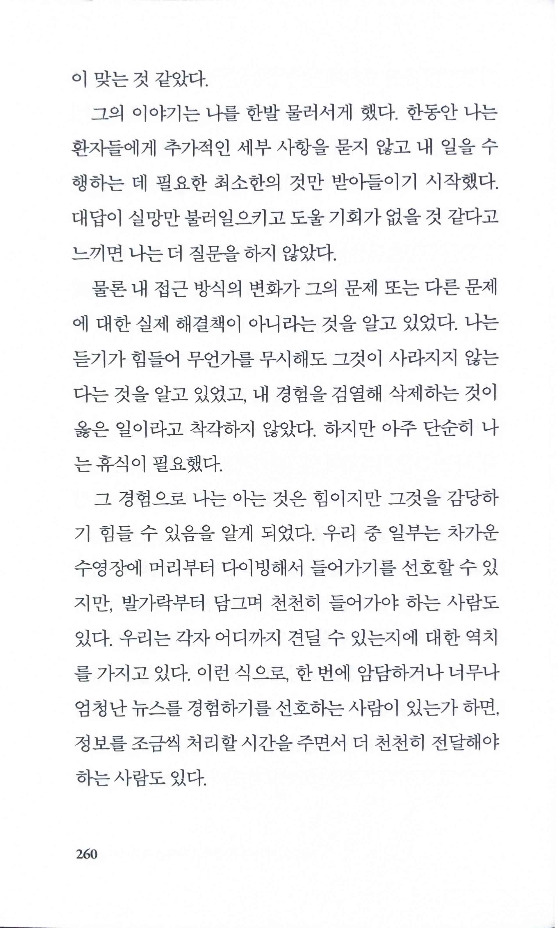 희망의 말을 건넬 때는 신중하고 적절히 조율해야 한다는 것을 어렵게 배웠다. 물론 희망을 적게 주면 타인의 세계를 조급하게 무너뜨릴 수 있지만, 과한 희망에 부풀게 하면 잘못된 낙관주의가 생겨 나중에 더 파괴적인 경험으로 이어질 수 있다