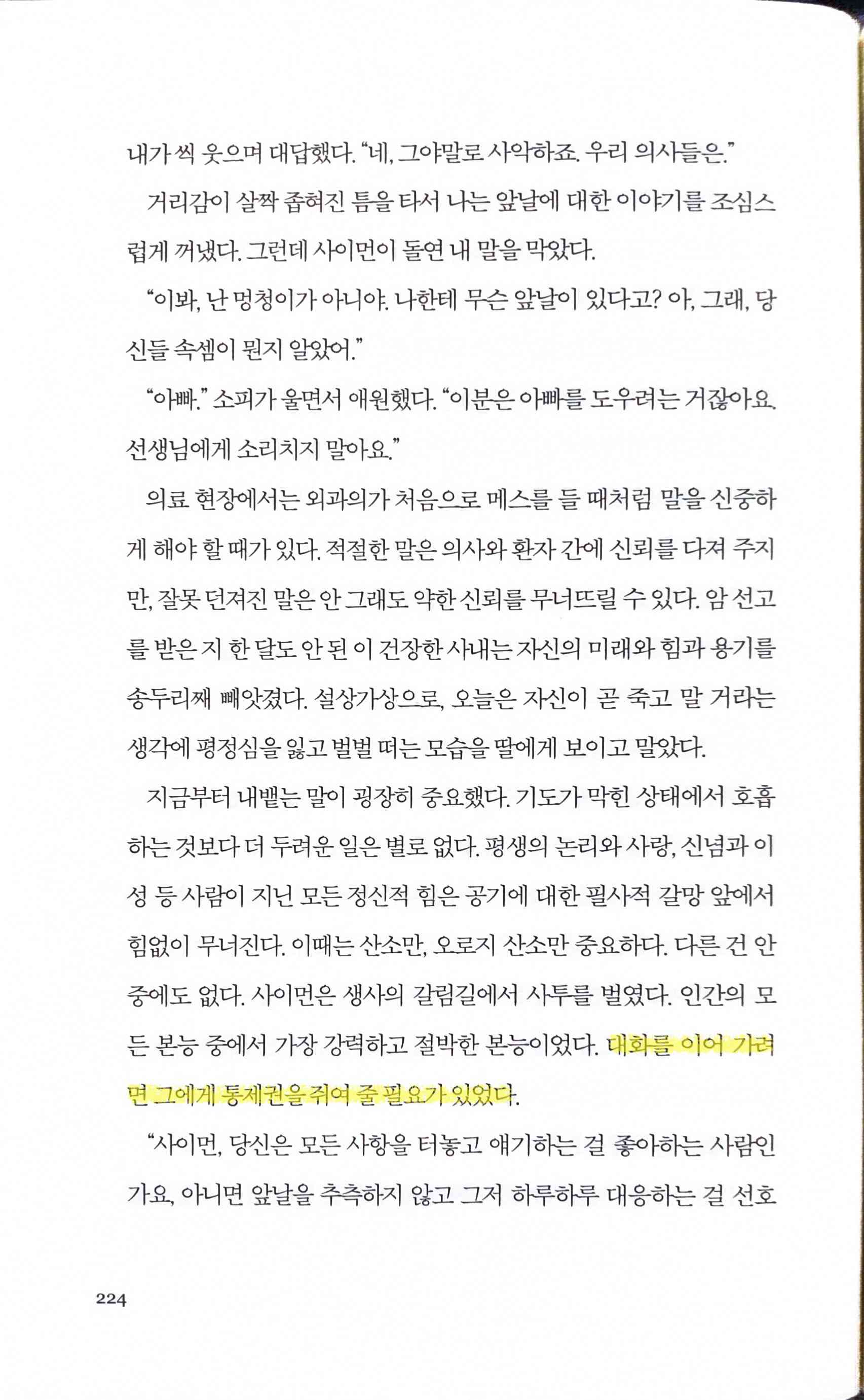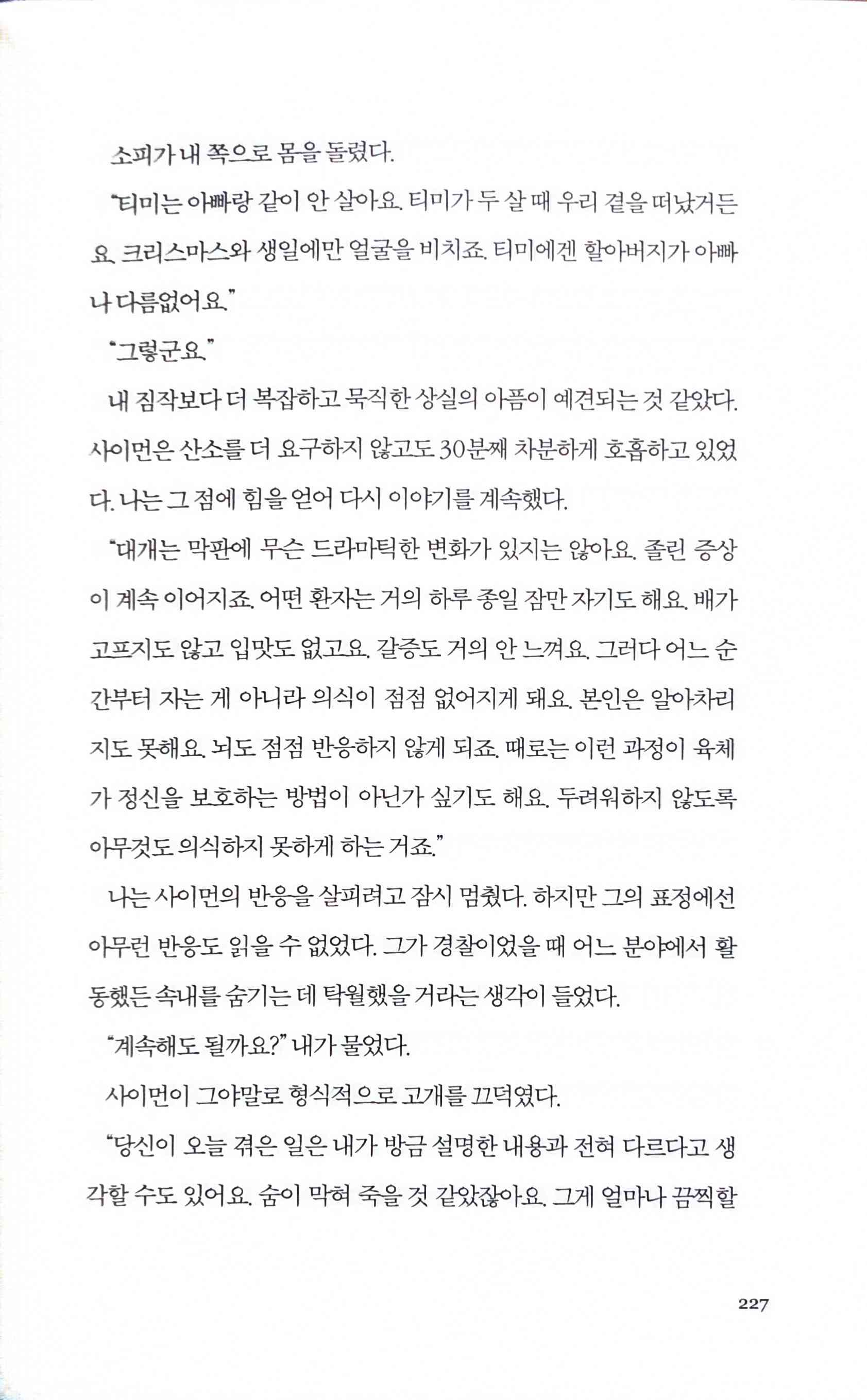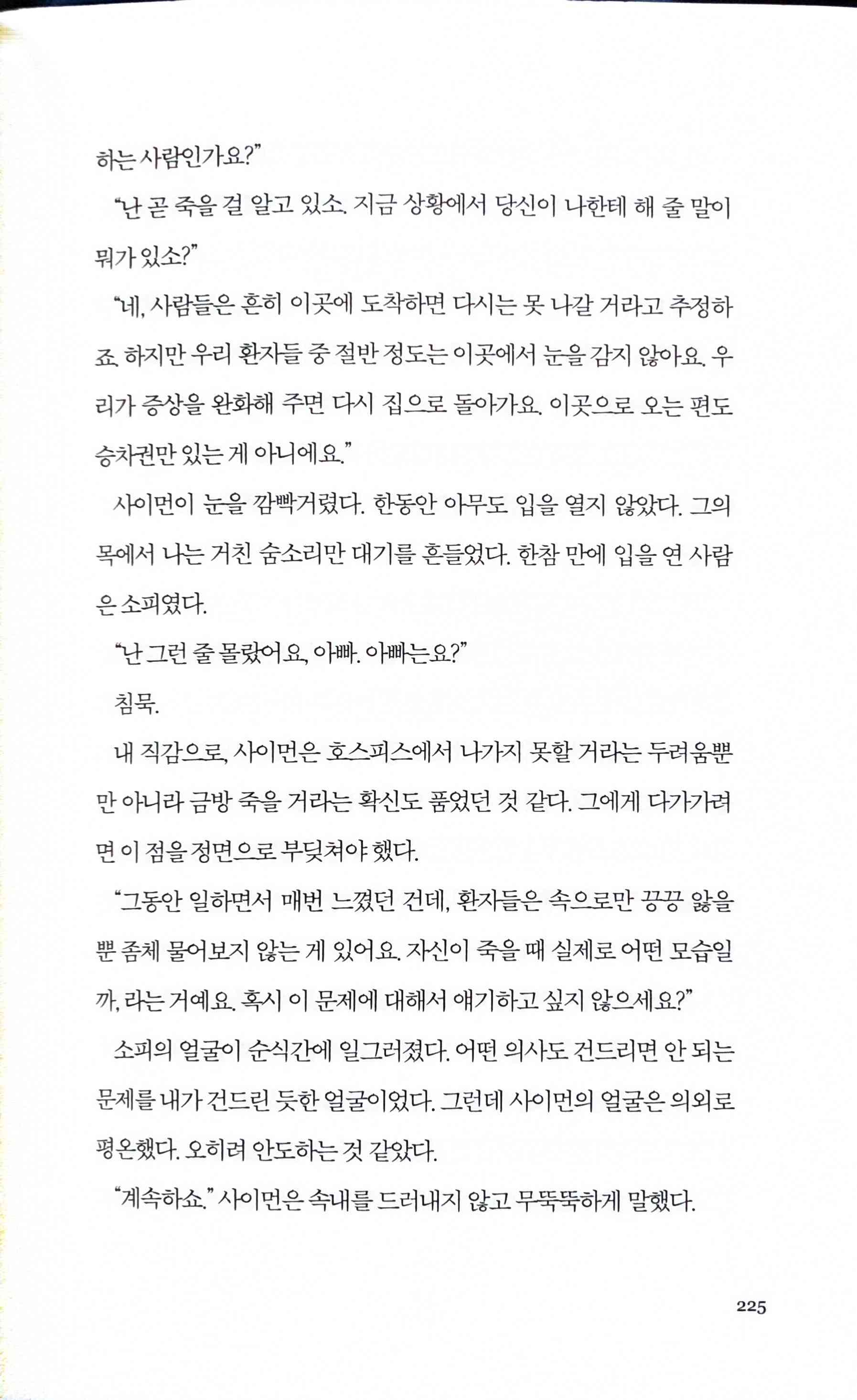 pp224~229 호스피스에서 만난 환자 중 한 명, 은퇴한 경찰인 사이먼과의 이야기. communication에 대한 깊은 통찰을 알 수 있다