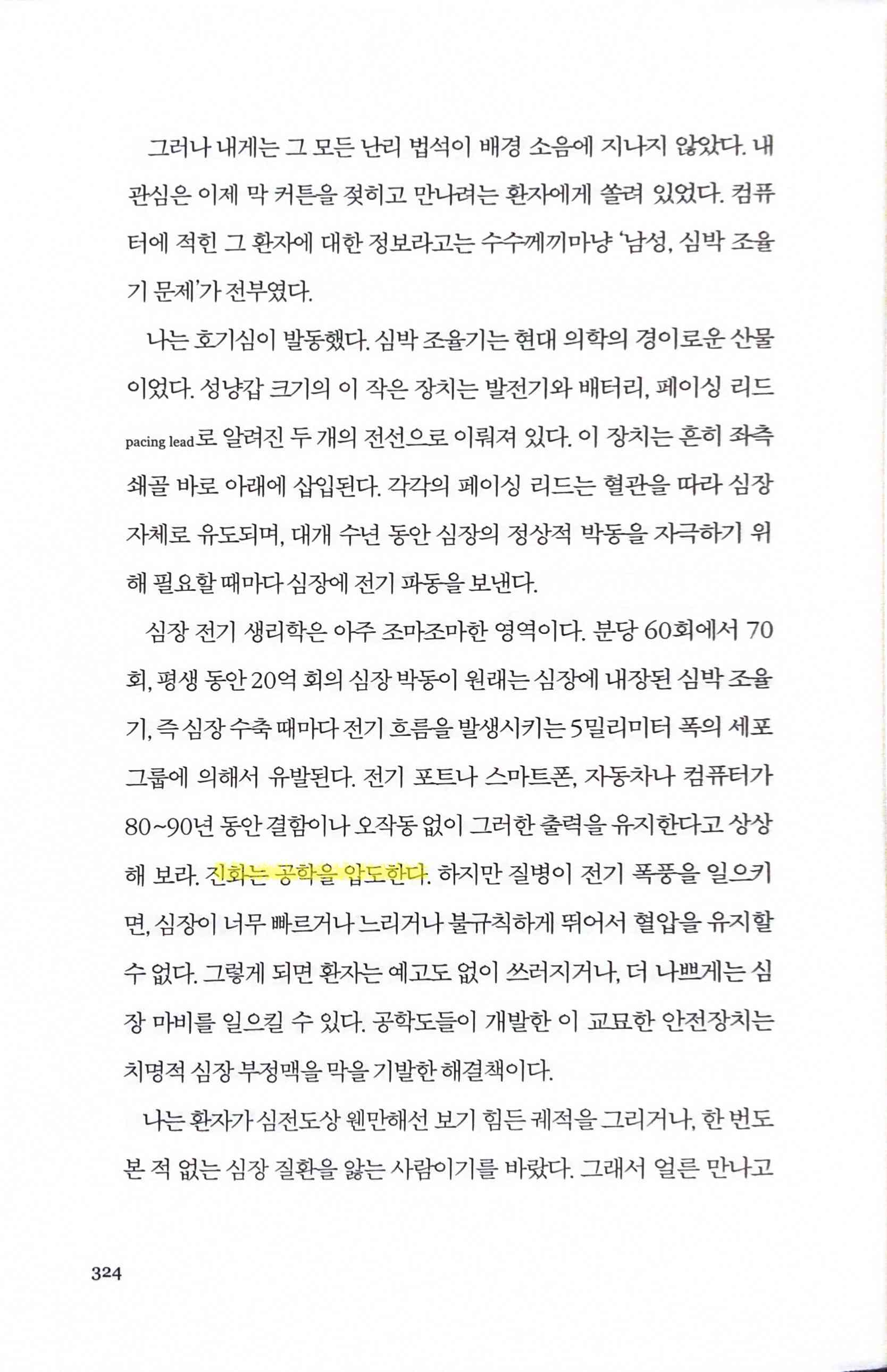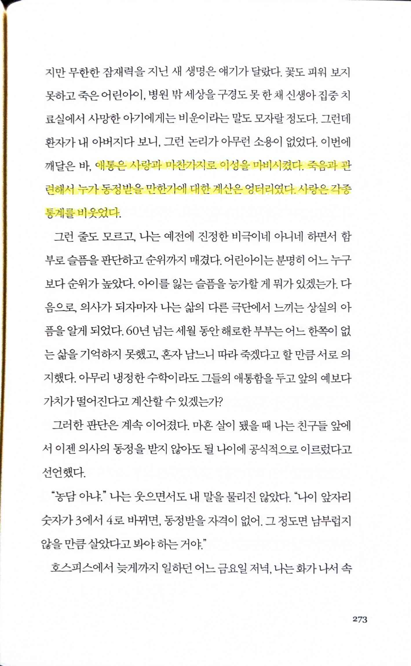 의사 아버지를 둔 의사 딸이 일생을 통해 의사로, 한 인간으로 성장하고 아버지를 보내는 순간까지를 담담하게 쓴 에세이. (아직 한달 반이 남긴 했지만 아마도) 올해 읽은 책 중 가장 깊은 울림을 남겼다. 짧은 기자 생활을 마치고 어릴 적부터 존경하던 아버지의 영향을 받아 의사의 길을 선택한 저자는 응급실을 거쳐 호스피스 전문의로서 삶을 살아간다. 호스피스라는 환경에서 죽음이 가까운 환자들의 삶의 끝을 지켜보며, 인간적인 의료를 실천하는 과정을 통해 자신 역시 성장해 간다.