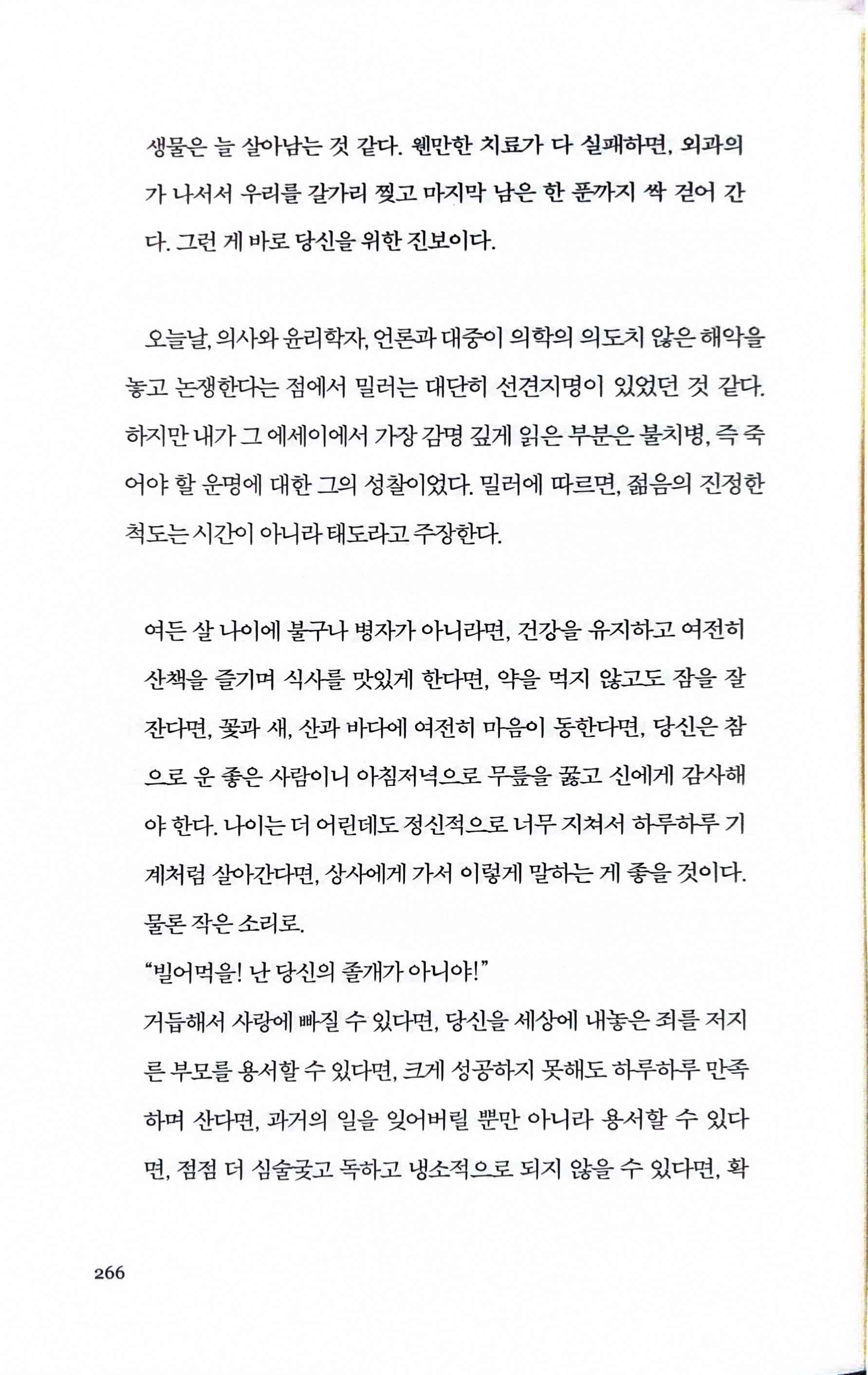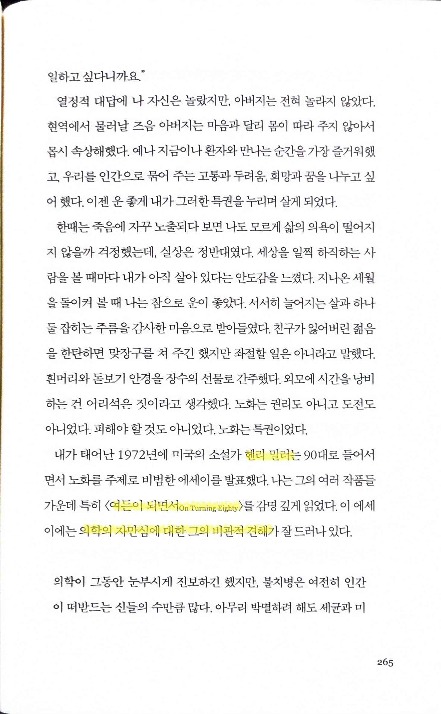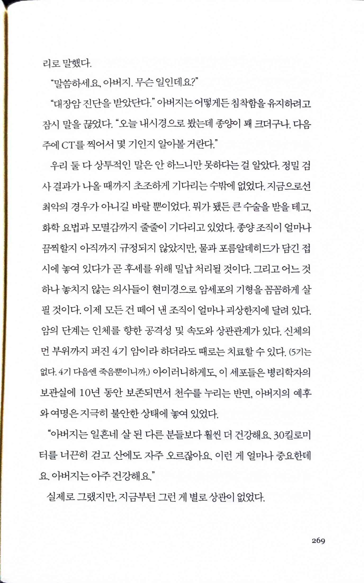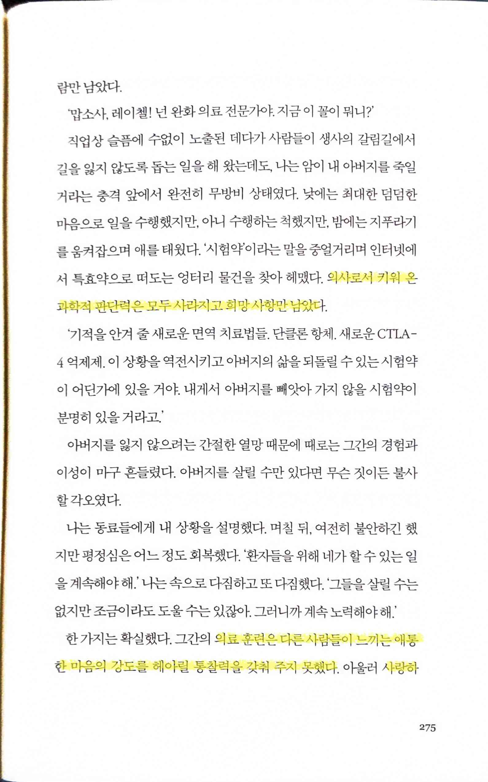 그러나 의학적 지식으로도 해결할 수 없는 순간이 찾아온다. 저자의 아버지가 암 진단을 받고, 그녀는 의료인으로서뿐 아니라 딸로서 아버지와의 남은 날들을 보내게 된다. 이 과정에서 깨닫는 것은, 아무리 많은 의학적 지식과 경험이 있어도 사랑하는 사람의 고통과 죽음을 온전히 이해하거나 받아들이는 데는 한계가 있다는 사실이다. 결국 그녀는 의사로서 배운 것뿐 아니라 인간으로서 느끼는 고통과 기쁨을 통해 아버지와의 마지막 시간을 보내며 성숙해 간다.