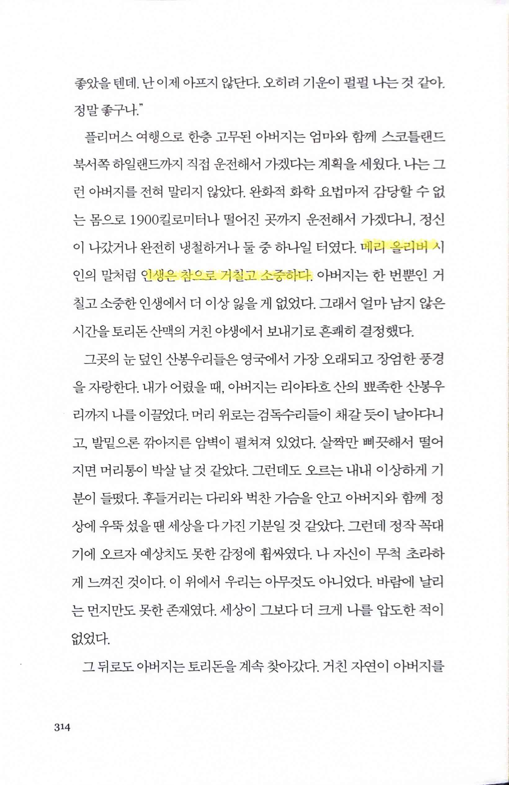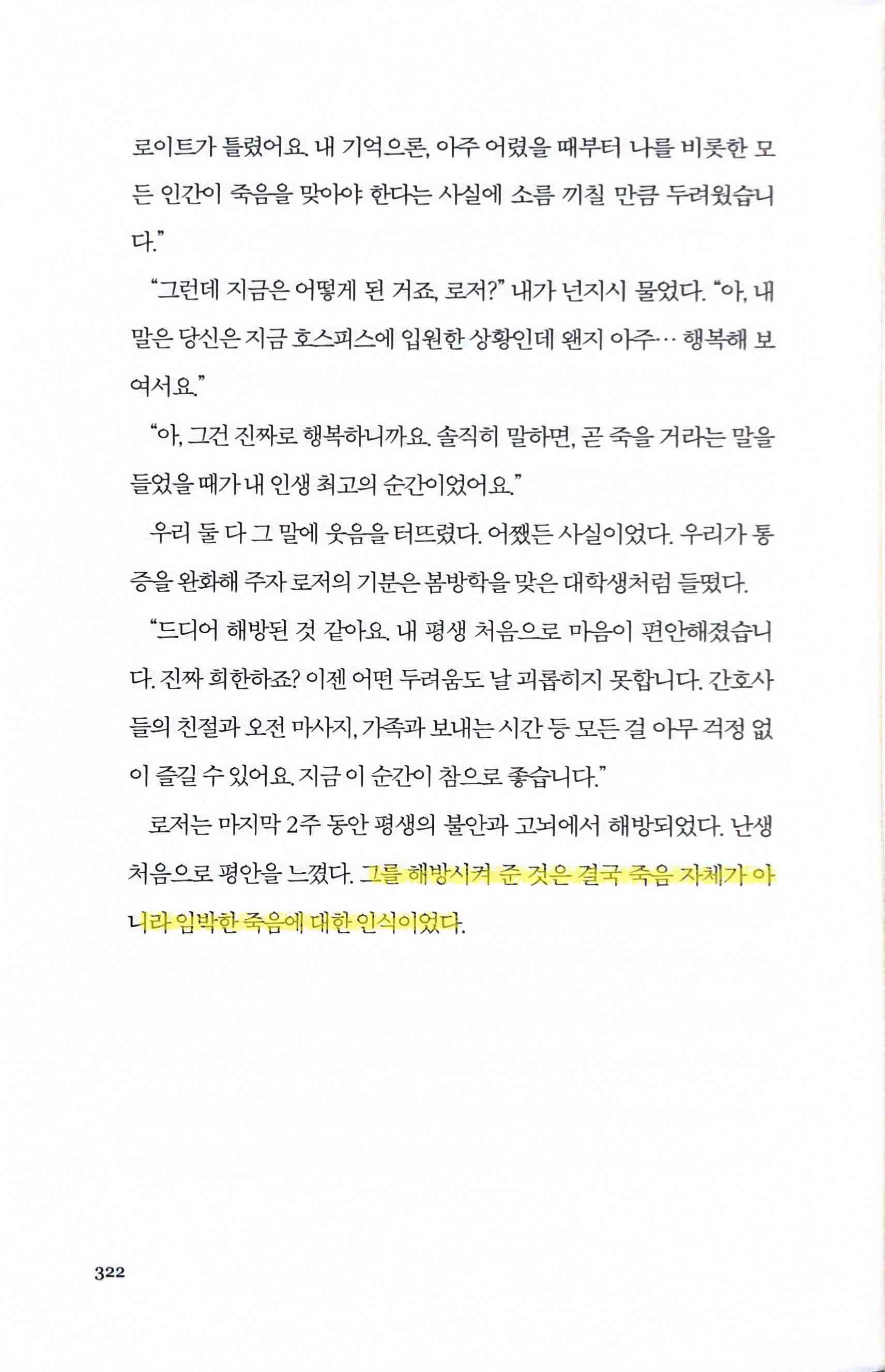 p322 우리의 인식이 결국 삶에 대한 태도, 삶 자체까지도 결정하는 강력한 힘을 갖는다는 걸… 머리로는 알고 있지만 나는 너무나 나약해서 여전히 이걸 실천하지는 못할 거 같다.