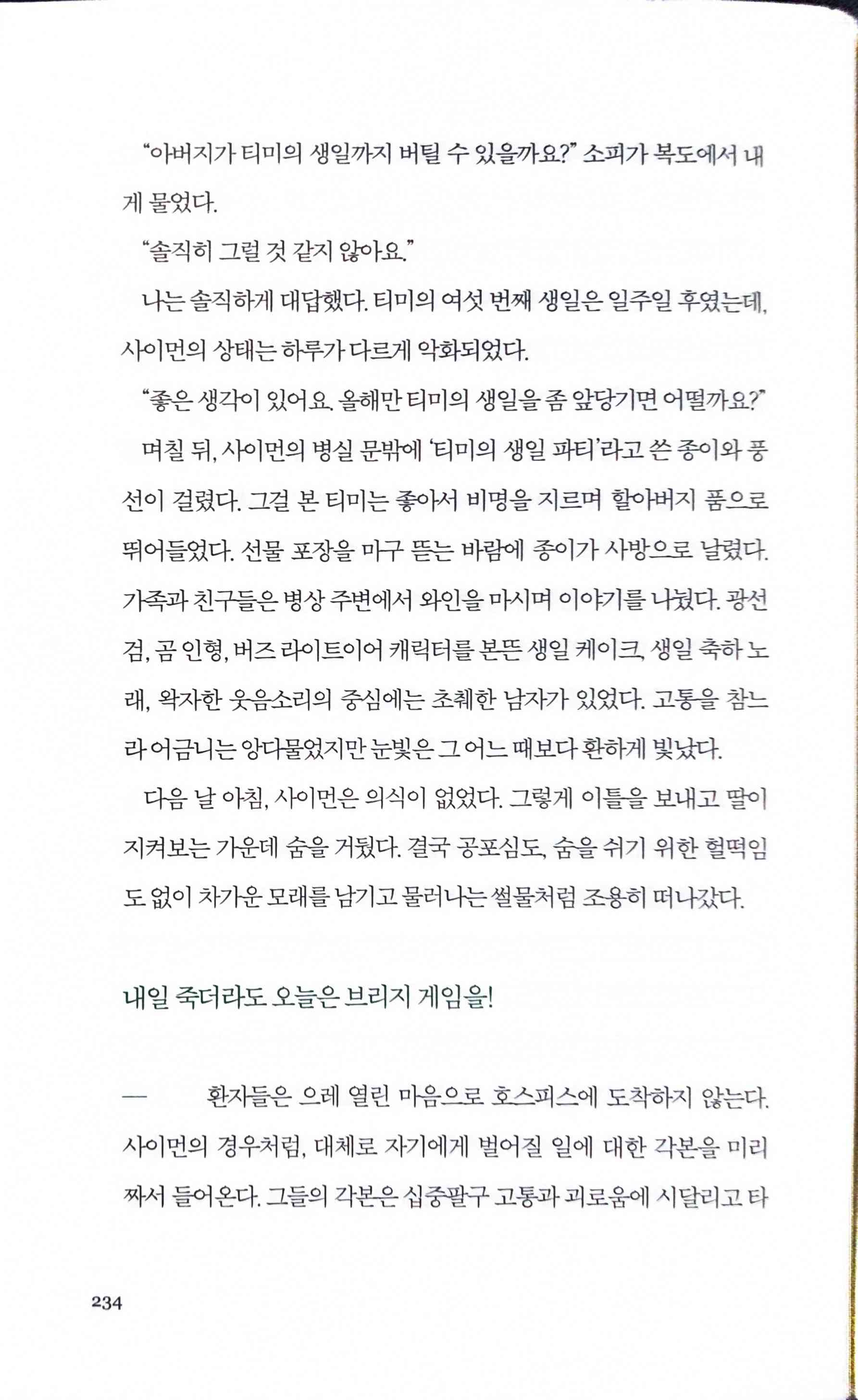 이 책은 나이 들어가는 독자들에게 특히 큰 울림을 줄 것이다. 삶의 마지막이 가까워질수록 중요한 것이 무엇인지, 떠나는 사람과 남겨지는 사람 모두에게 어떤 시간이 필요한지에 대해 깊이 생각하게 한다. 나 역시 이 책을 통해 아내가 장인어른을 떠나보낼 때 느꼈던 마음을 조금이나마 이해할 수 있었다고 감히 말해 본다.