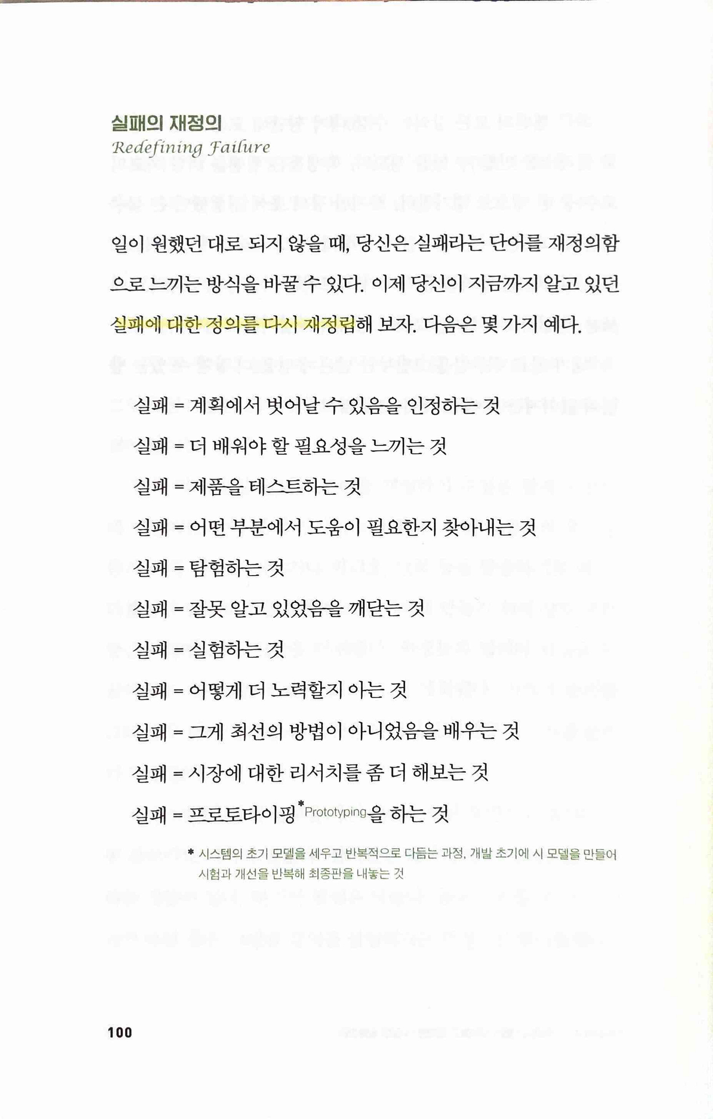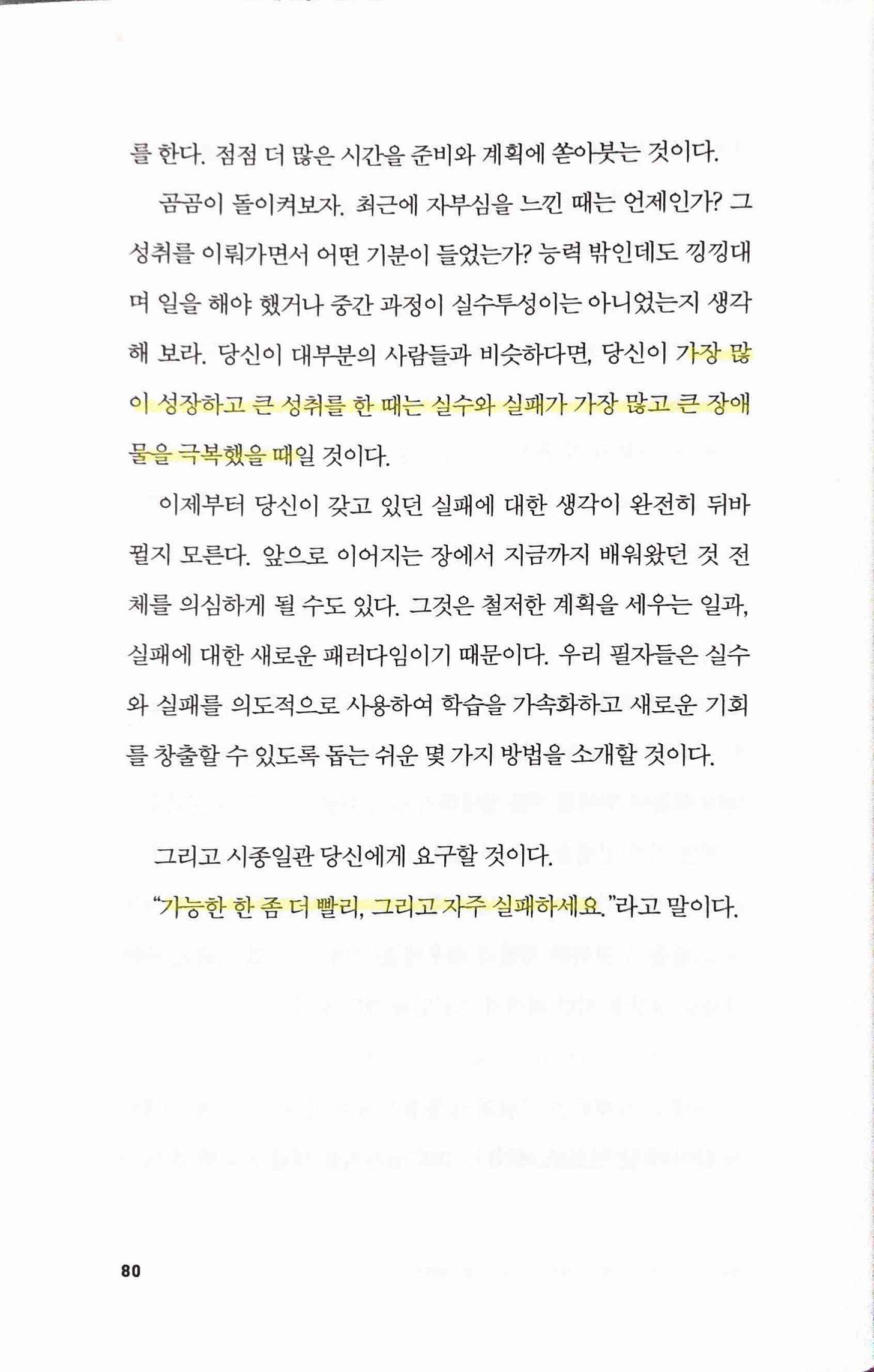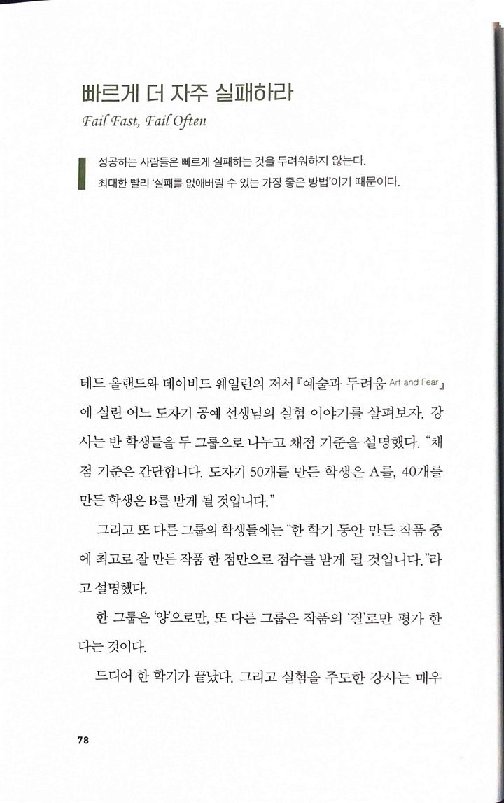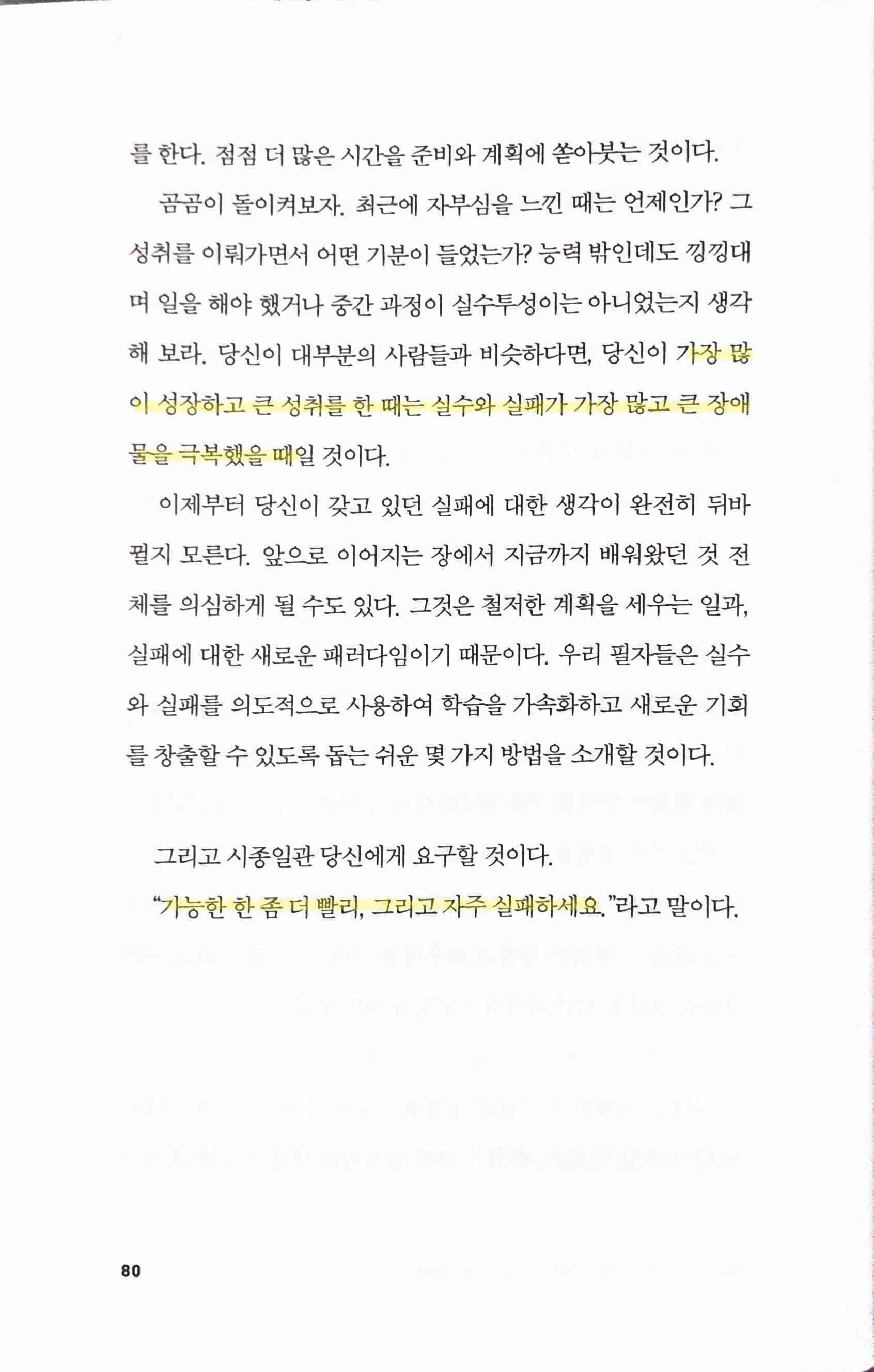 혁신가들의 공통점은 요령을 터득해 앞으로 전진하고 많은 교훈을 얻기까지 기꺼이 실패에 실패를 거듭한다는 점... 어떤 것이든 배우고 이것을 터득하는 최선의 방법이 가능한 빨리 실패하는 것이라는 사실... 성공하는 사람들은 빠르게 실패하는 것을 두려워하지 않는다. 최대한 빨리 실패를 없애버릴 수있는 가장 좋은 방법이기 때문.