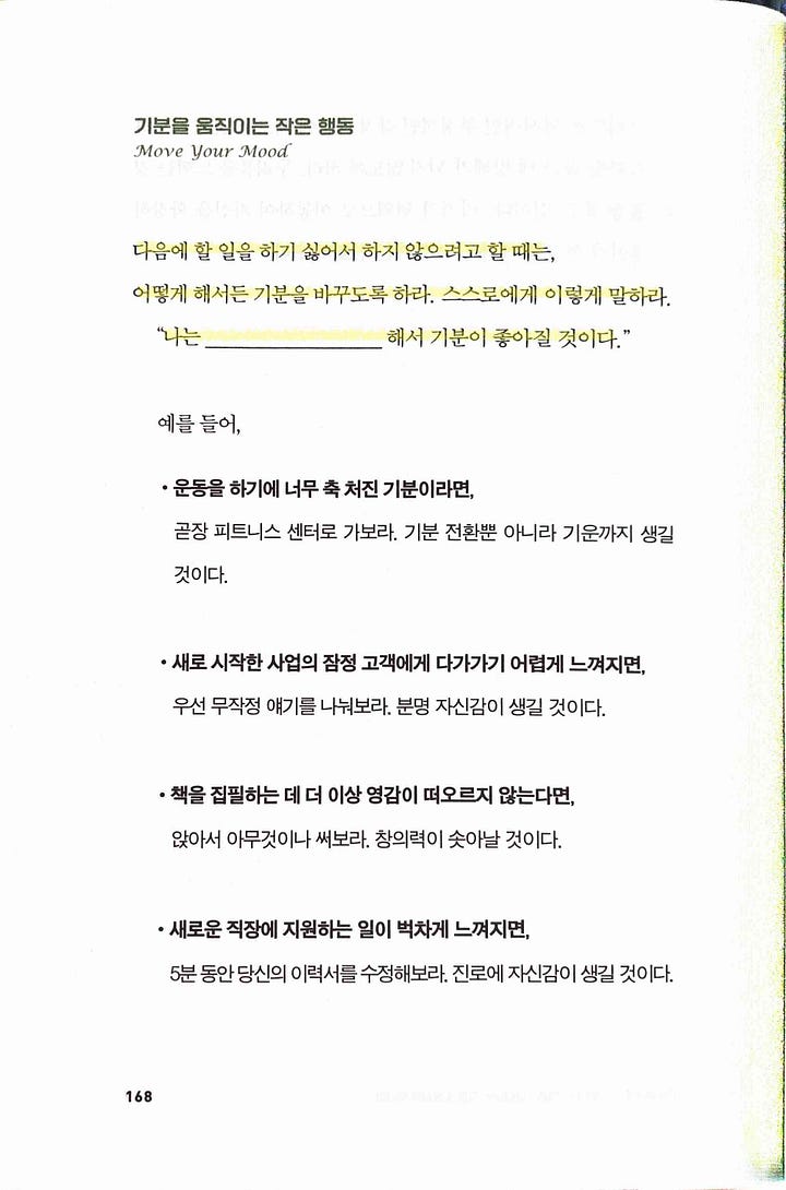 다음에 할 일을 하기 싫어서 하지 않으려고 할 때는, 어떻게 해서든 기분을 바꾸도록 하라. 스스로에게 이렇게 말하라. "나는 ~해서 기분이 좋아질 것이다."