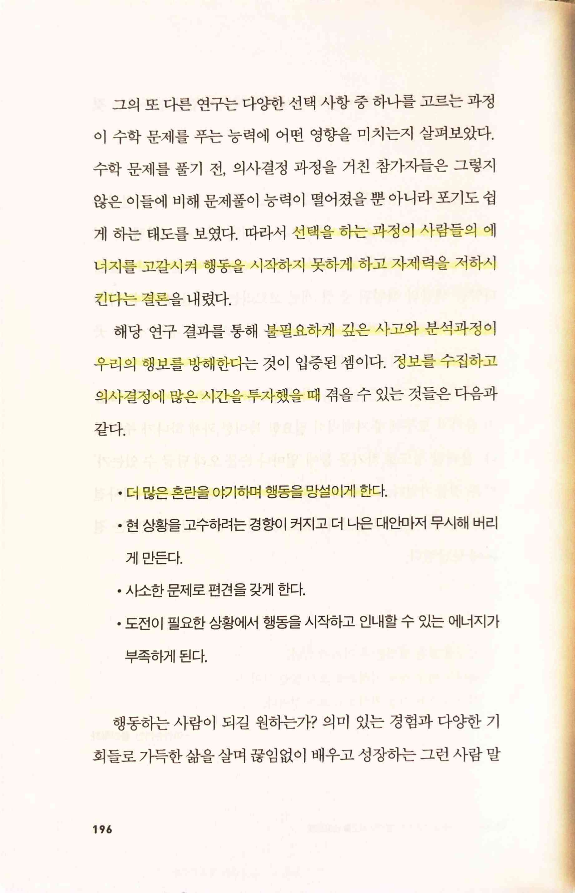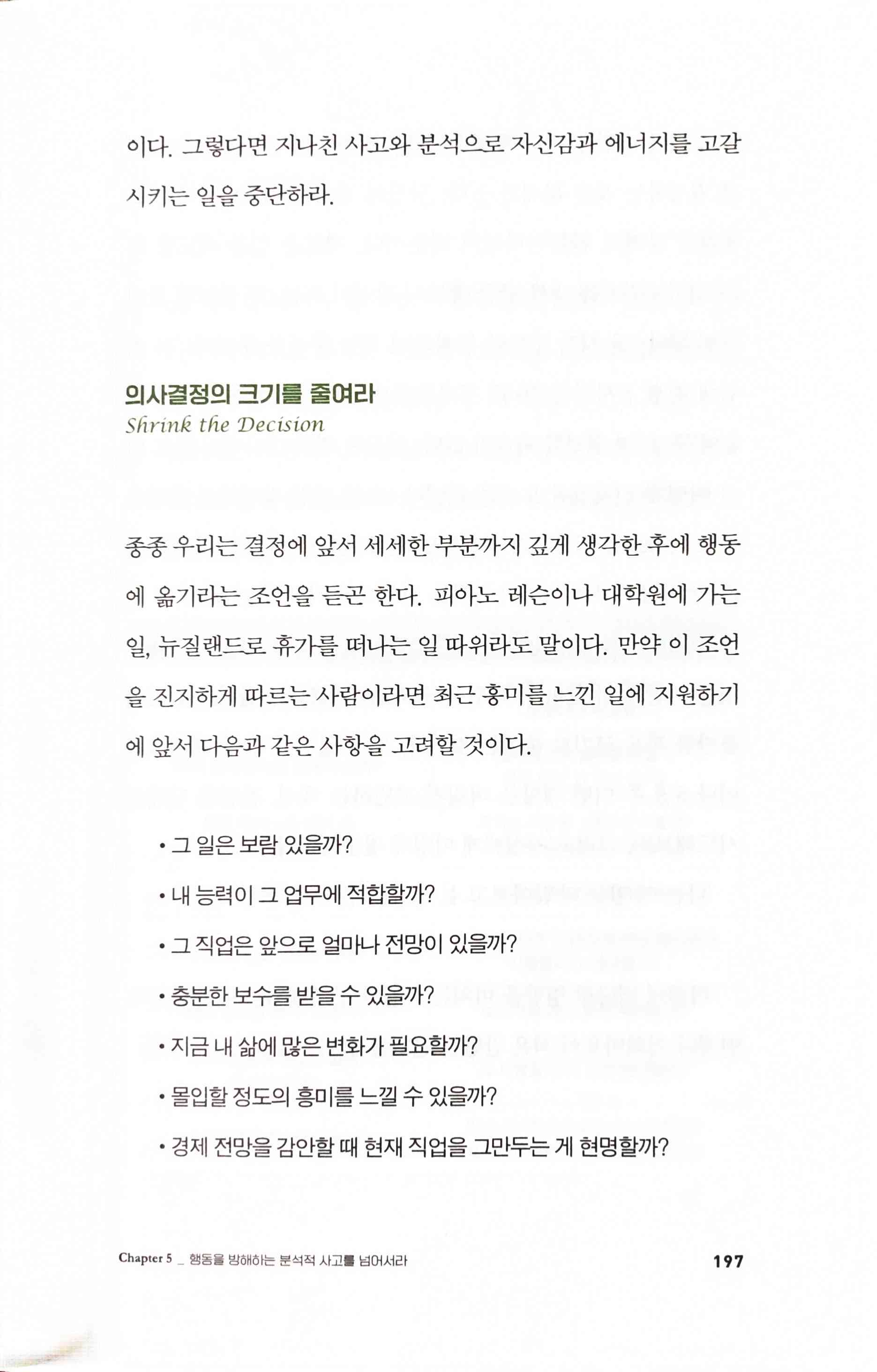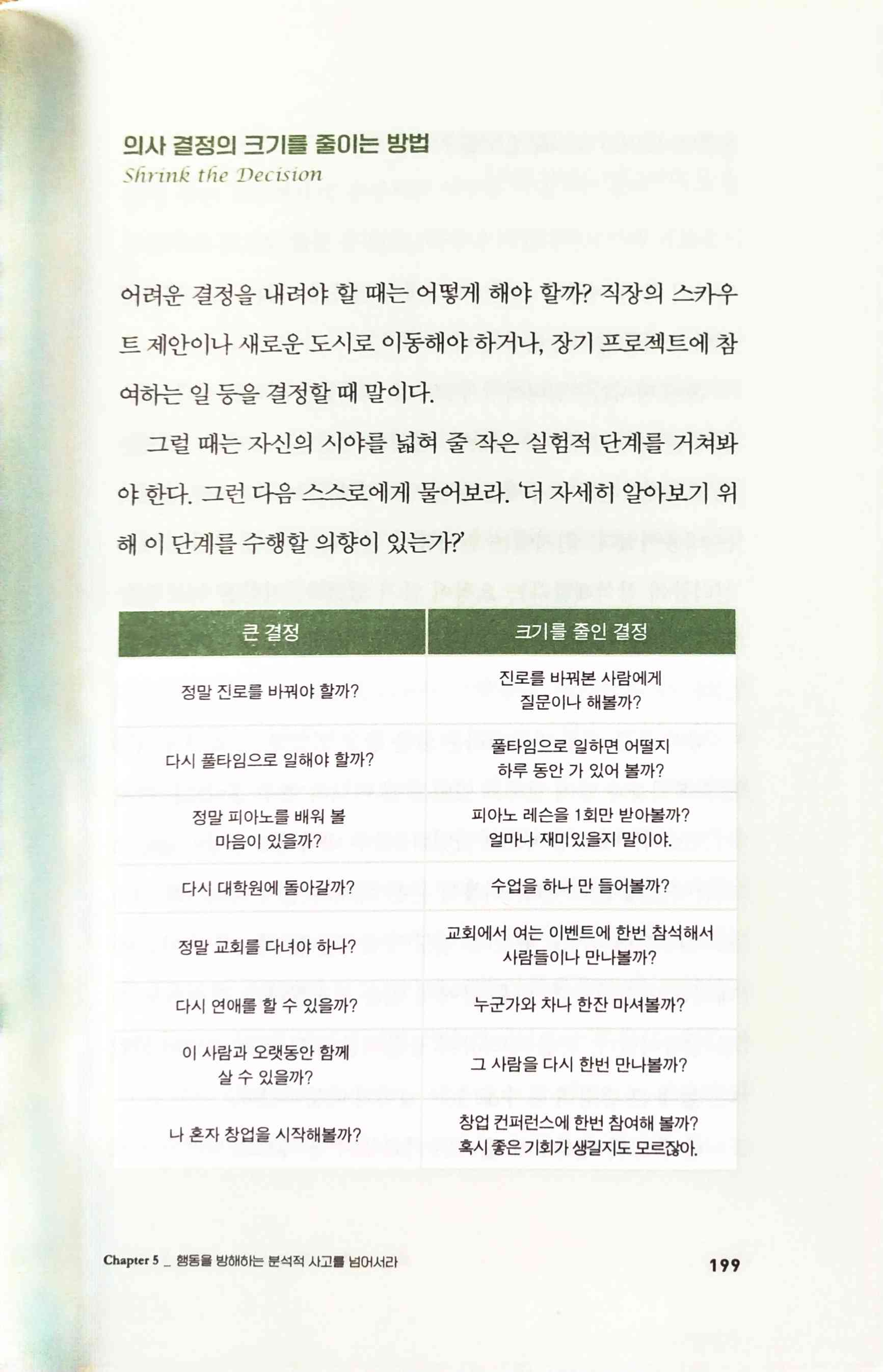 고려할 선택 사항이 너무 낳아 혼란스러운 상황의 대처법... 핵심은 선택 사항을 단순화하고 행동으로 옮기는 것... 핵심 사항에 집중하고 곧바로 행동으로 옮기면 불필요한 분석에 자신을 끊임없이 가둬두지 않을 수 있다.