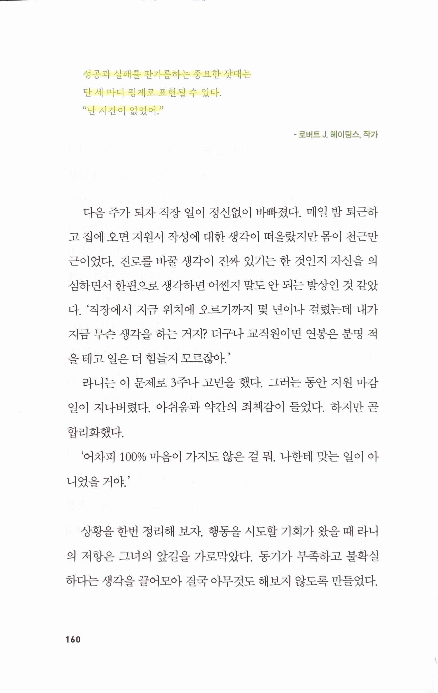 성공과 실패를 판가름하는 중요한 잣대는 단 세 마디 핑계로 표현될 수 있다. "난 시간이 없었어." - 로버트 J. 헤이팅스 작가