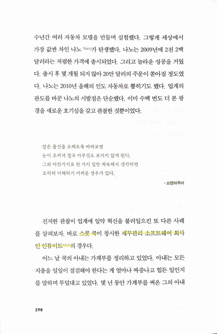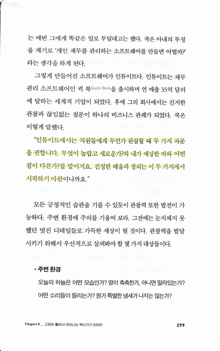 “인튜이트에서는 직원들에게 무언가 관찰할 때 두 가지 자문을 권합니다. 무엇이 놀랍고 새로운가? 내가 예상한 바와 어떤 점이 다른가? 말이지요. 진정한 배움과 창의는 이 두 가지에서 시작하기 마련이니까요."
