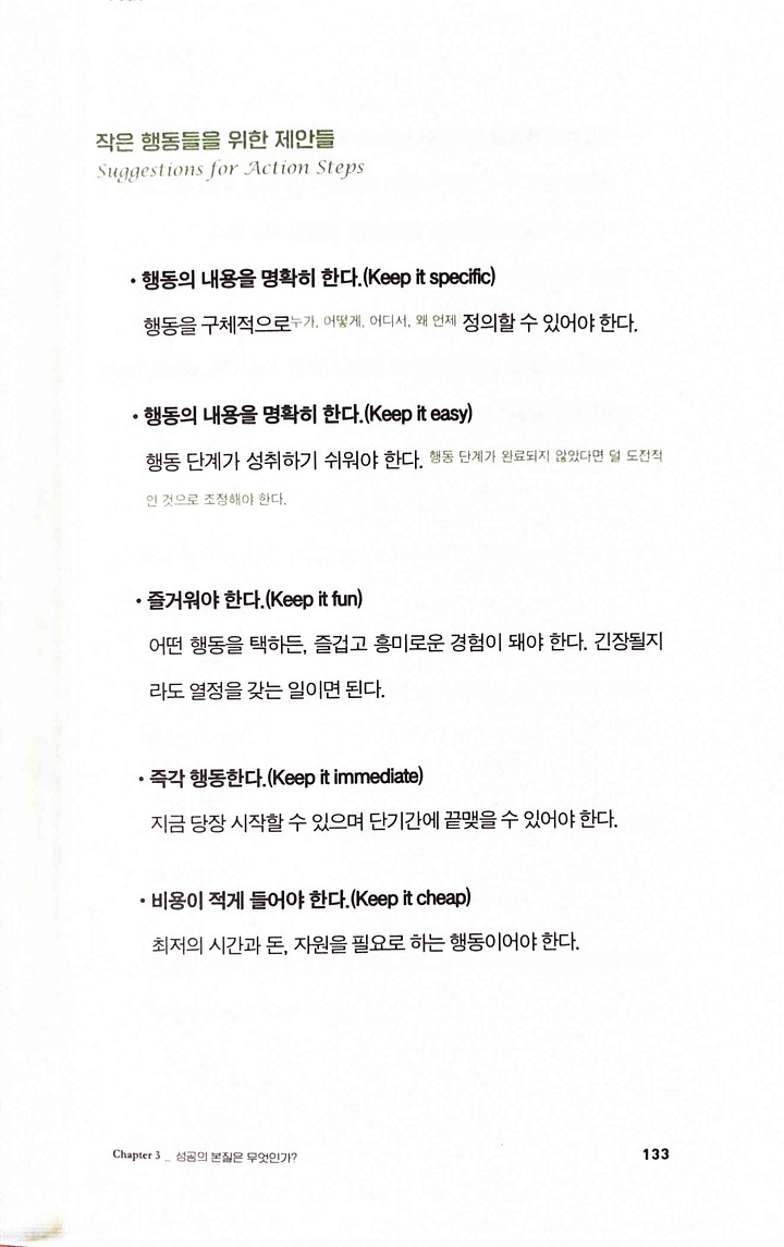 • 즐거워야 한다.(Keep it fun) 어떤 행동을 택하든, 즐겁고 흥미로운 경험이 돼야 한다. 긴장될지라도 열정을 갖는 일이면 된다.