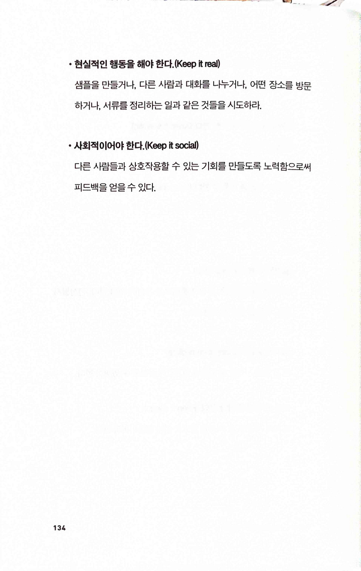 • 현실적인 행동을 해야 한다. (Keep it real) 샘플을 만들거나, 다른 사람과 대화를 나누거나, 어떤 장소를 방문하거나, 서류를 정리하는 일과 같은 것들을 시도하라.