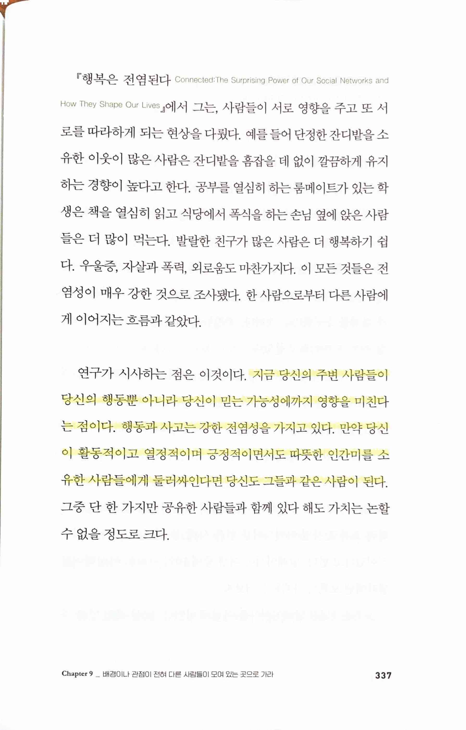 지금 당신의 주변 사람들이 당신의 행동뿐 아니라 당신이 믿는 가능성에까지 영향을 미친다는 점이다. 행동과 사고는 강한 전염성을 가지고 있다. 만약 당신이 활동적이고 열정적이며 긍정적이면서도 따뜻한 인간미를 소유한 사람들에게 둘러싸인다면 당신도 그들과 같은 사람이 된다.
