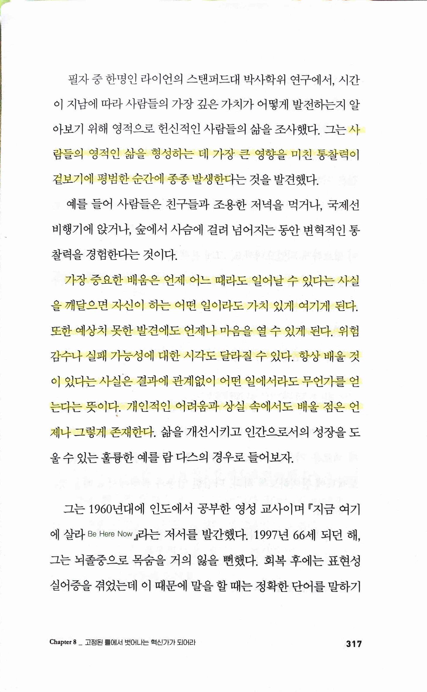 가장 중요한 배움은 언제 어느 때라도 일어날 수 있다는 사실을 깨달으면 자신이 하는 어떤 일이라도 가치 있게 여기게 된다. 또한 예상치 못한 발견에도 언제나 마음을 열 수 있게 된다. 위험감수나 실패 가능성에 대한 시각도 달라질 수 있다. 항상 배울 것이 있다는 사실은 결과에 관계없이 어떤 일에서라도 무언가를 얻는다는 뜻이다. 개인적인 어려움과 상실 속에서도 배울 점은 언제나 그렇게 존재한다.