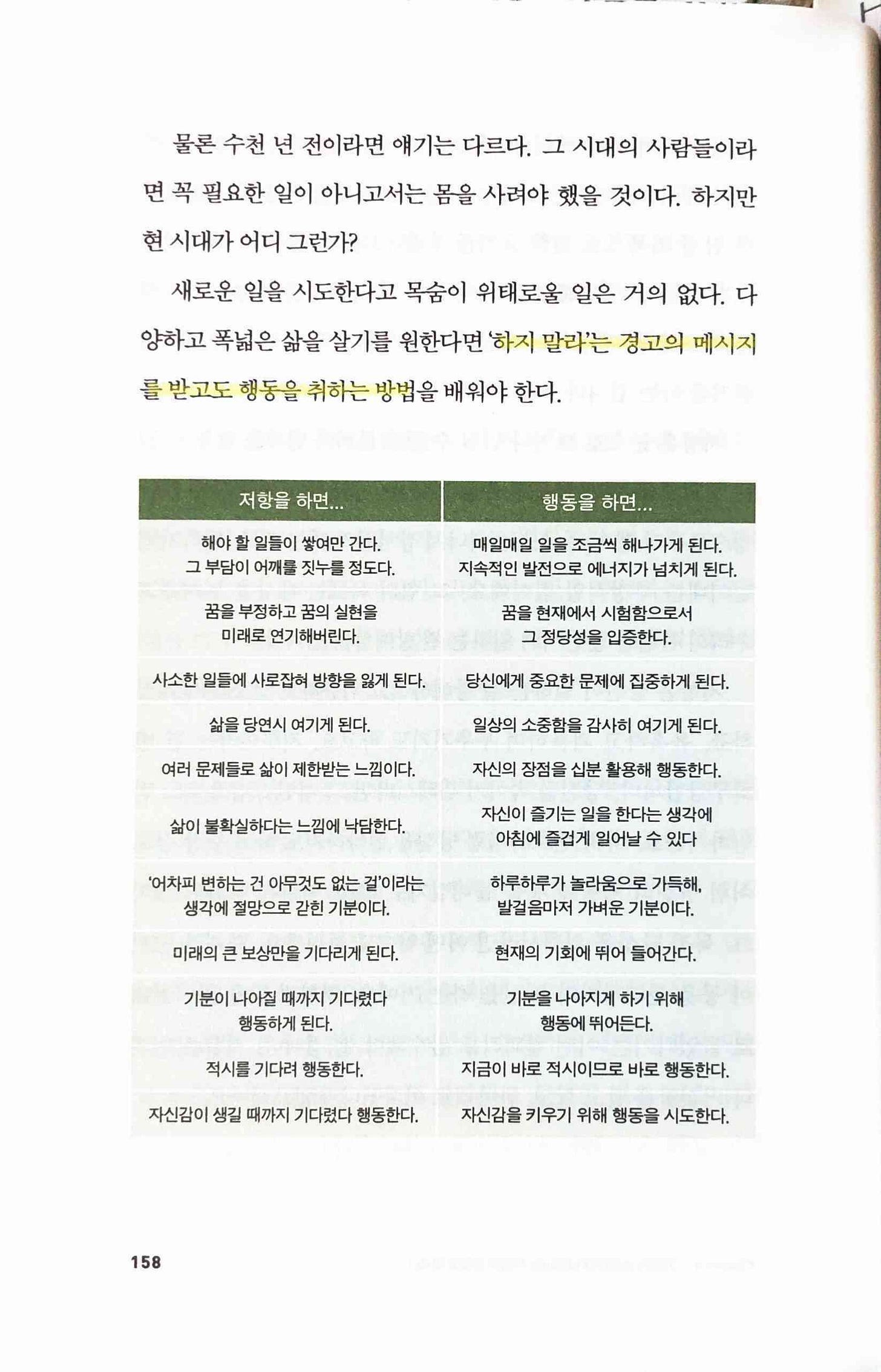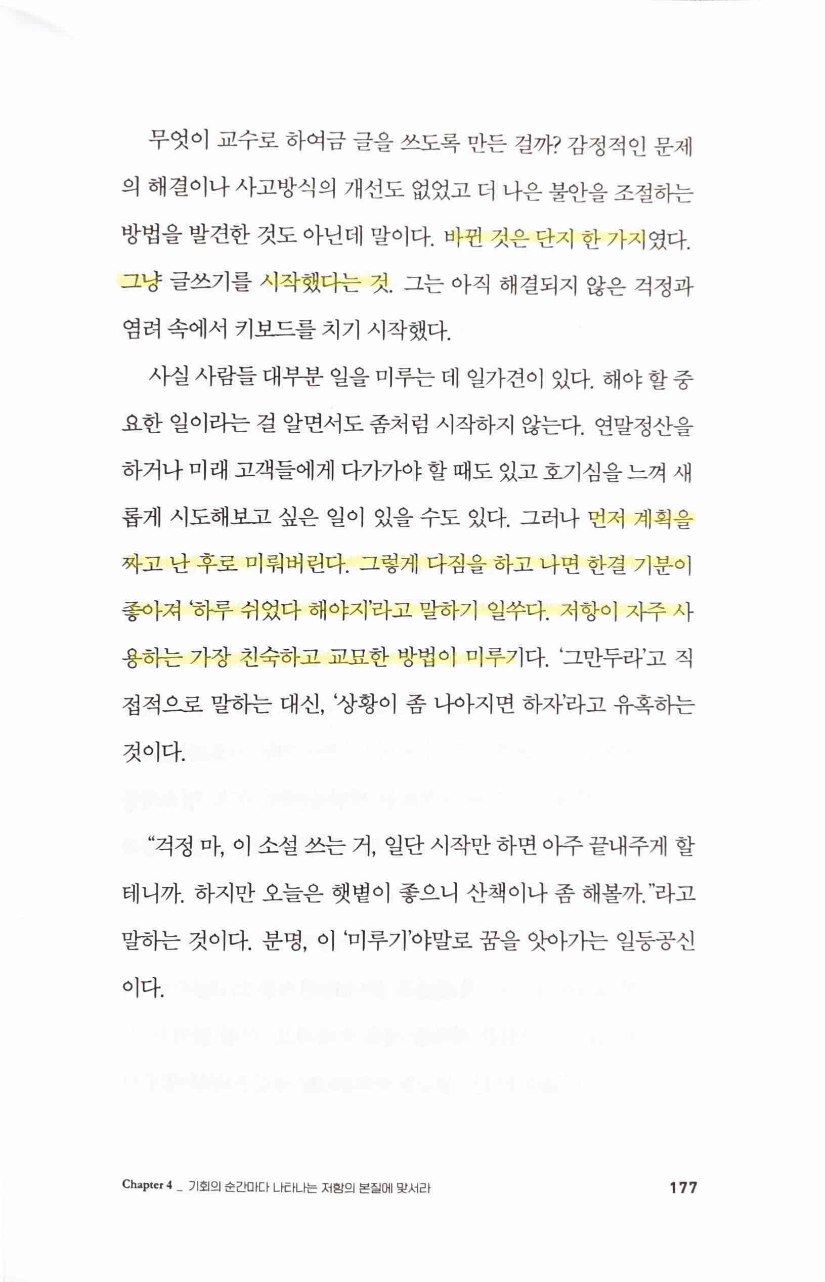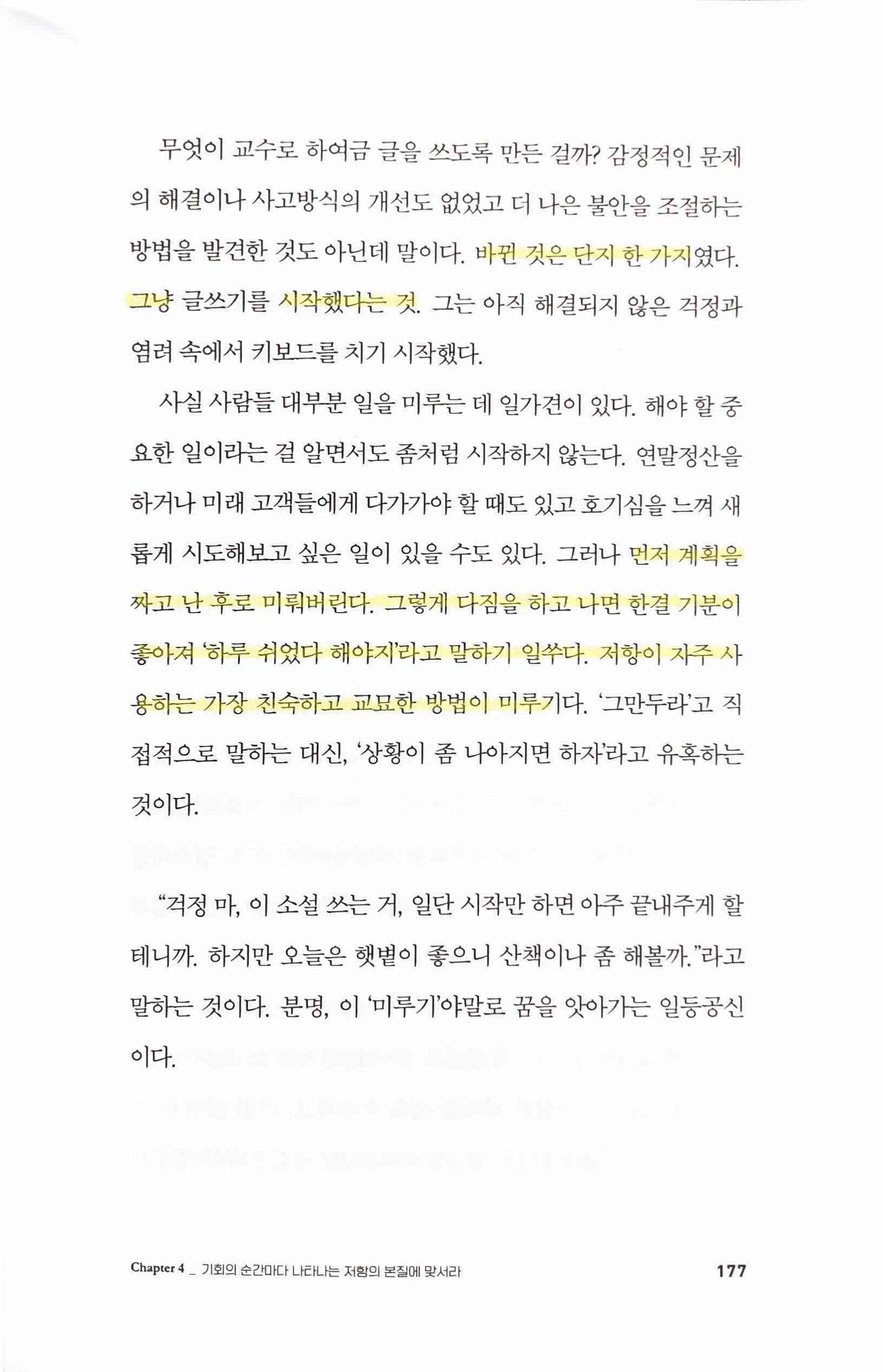 사람들 대부분 일을 미루는 데 일가견이 있다... 먼저 계획을 짜고 난 후로 미뤄버린다. 그렇게 다짐을 하고 나면 한결 기분이 좋아져 '하루 쉬었다 해야지'라고 말하기 일쑤다. 저항이 자주 사용하는 가장 친숙하고 교묘한 방법이 미루기다.