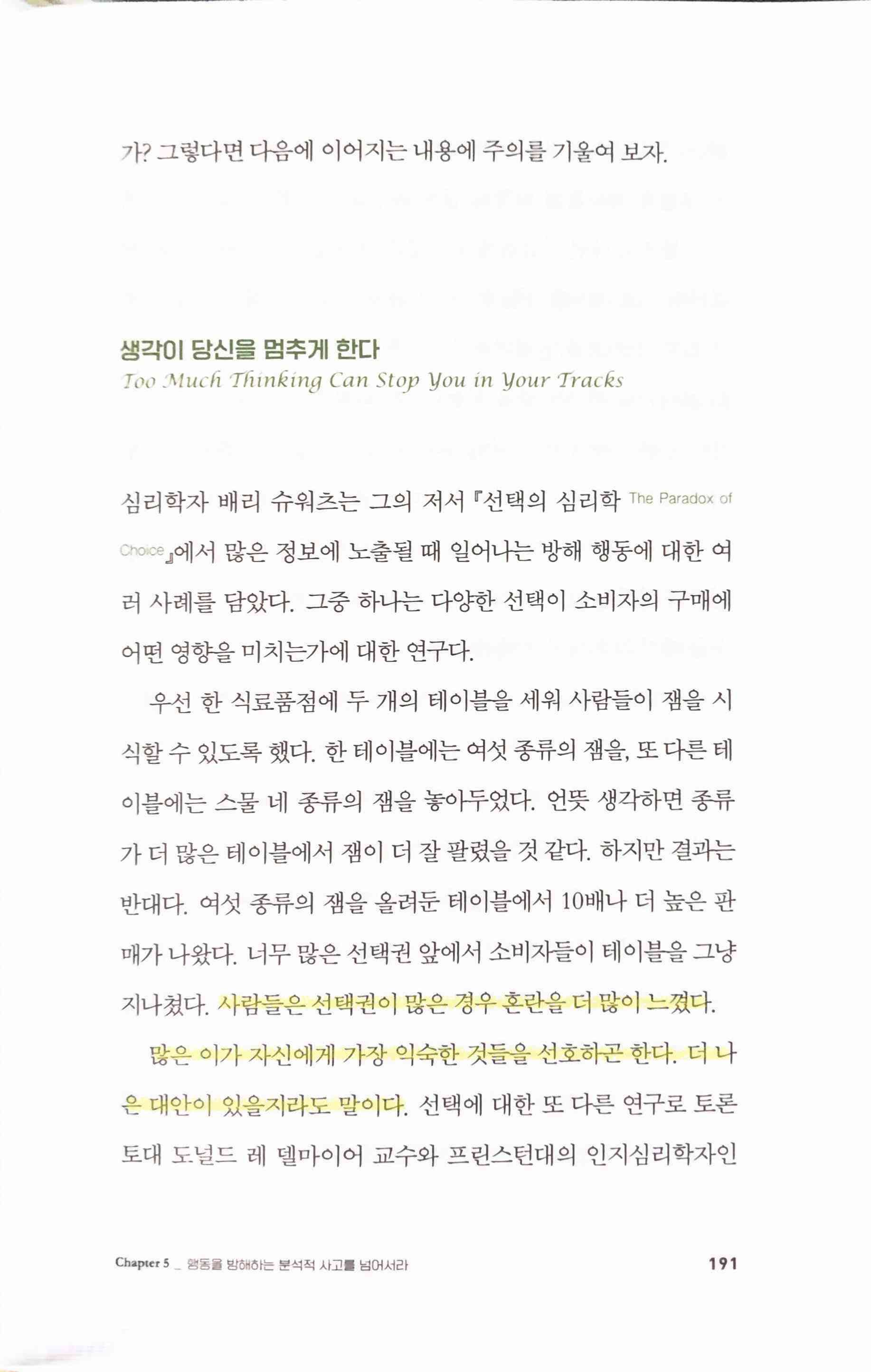 해당 연구 결과를 통해 불필요하게 깊은 사고와 분석과정이 우리의 행보를 방해한다... 정보를 수집하고 의사결정에 많은 시간을 투자했을 때 ... 더 많은 혼란을 야기하며 행동을 망설이게 한다.
