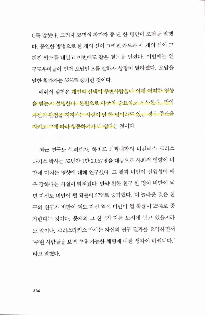 애쉬의 실험은 개인의 선택이 주변사람들에 의해 어떠한 영향을 받는지 설명한다. 한편으로