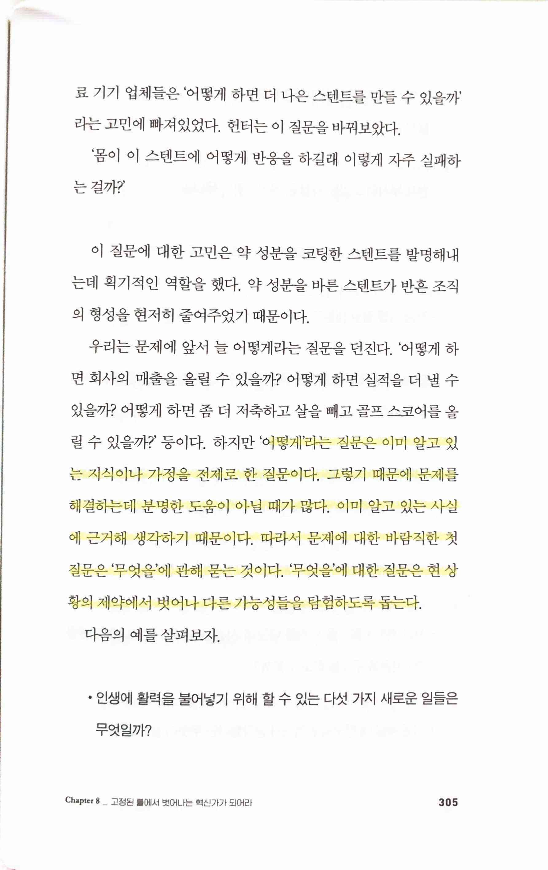 어떻게라는 질문은 이미 알고 있는 지식이나 가정을 전제로 한 질문이다. 그렇기 때문에 문제를 해결하는데 분명한 도움이 아닐 때가 많다. 이미 알고 있는 사실에 근거해 생각하기 때문이다. 따라서 문제에 대한 바람직한 첫 질문은무엇을에 관해 묻는 것이다.무엇을에 대한 질문은 현상황의 제약에서 벗어나 다른 가능성들을 탐험하도록 돕는다.