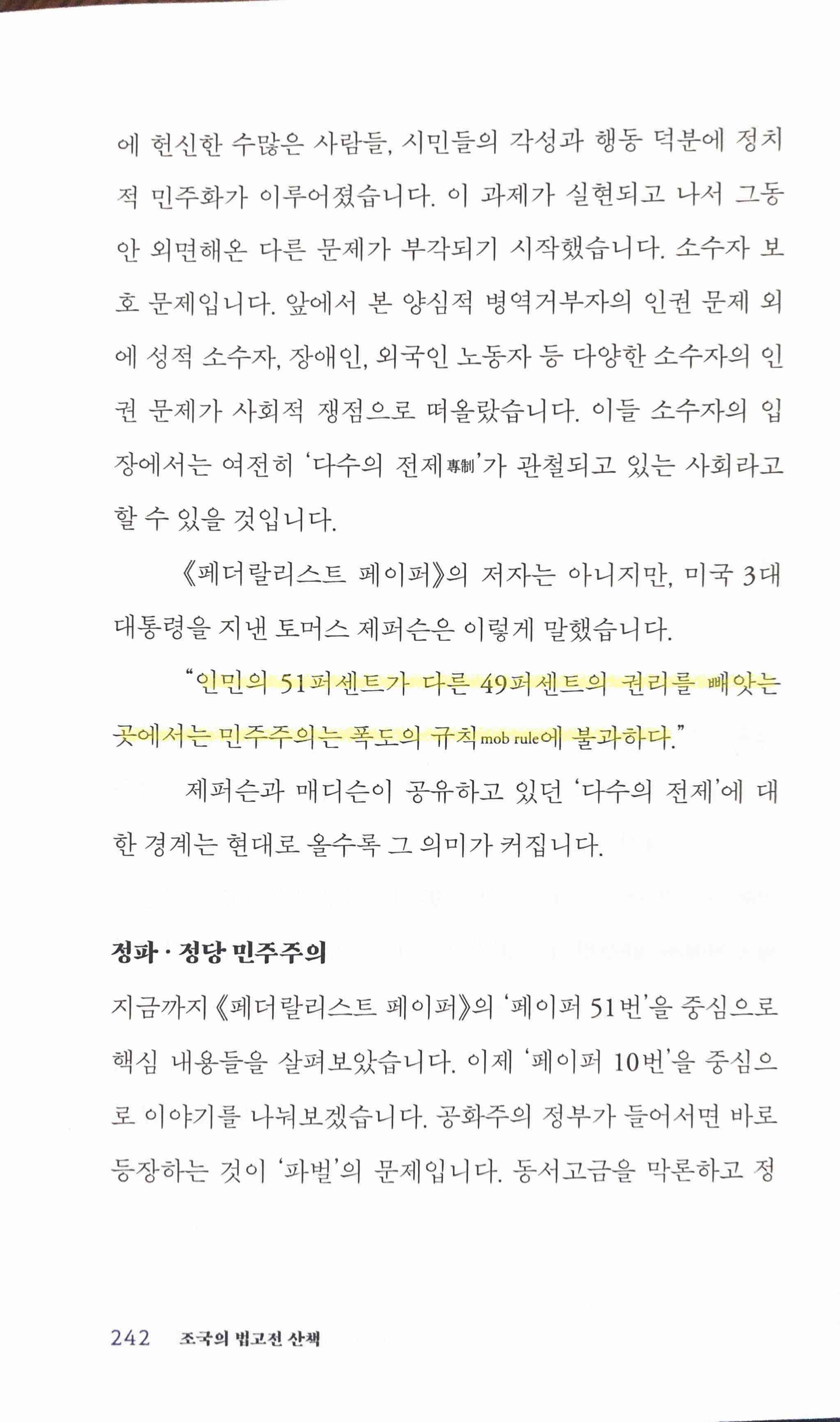 토머스 제퍼슨 “인민의 51퍼센트가 다른 49퍼센트의 권리를 빼앗는곳에서는 민주주의는 폭도의 규칙 mob rule에 불과하다.”