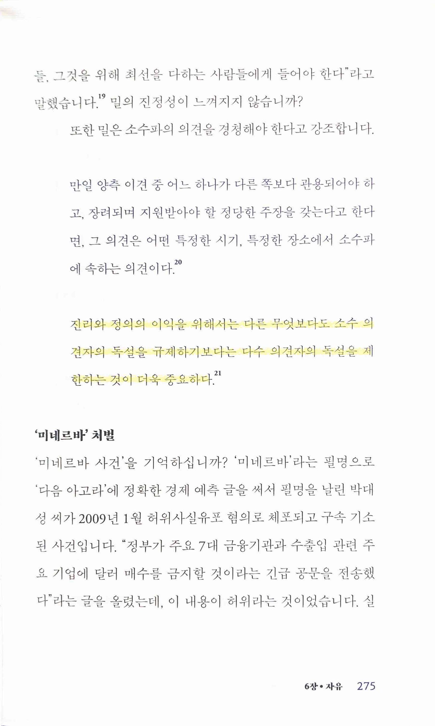 진리와 정의의 이익을 위해서는 다른 무엇보다도 소수의 의견자의 독설을 규제하기보다는 다수 의견자의 독설을 제한하는 것이 더욱 중요하다.
