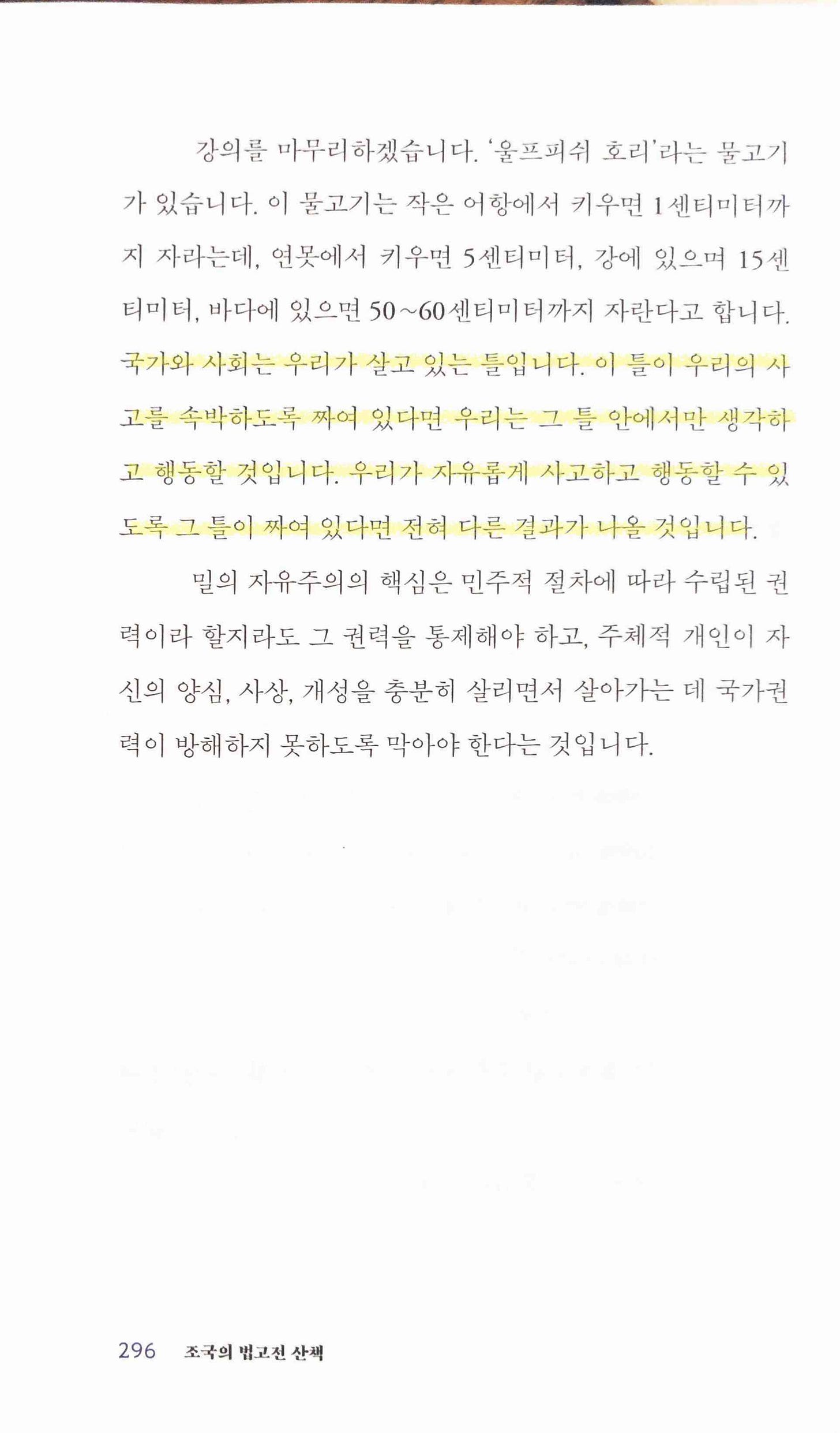 '울프피쉬 호리'... 국가와 사회는 우리가 살고 있는 틀입니다. 이 틀이 우리의 사고를 속박하도록 짜여 있다면 우리는 그 틀 안에서만 생각하고 행동할 것입니다. 우리가 자유롭게 사고하고 행동할 수 있도록 그 틀이 짜여 있다면 전혀 다른 결과가 나올 것입니다.