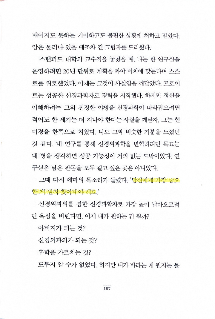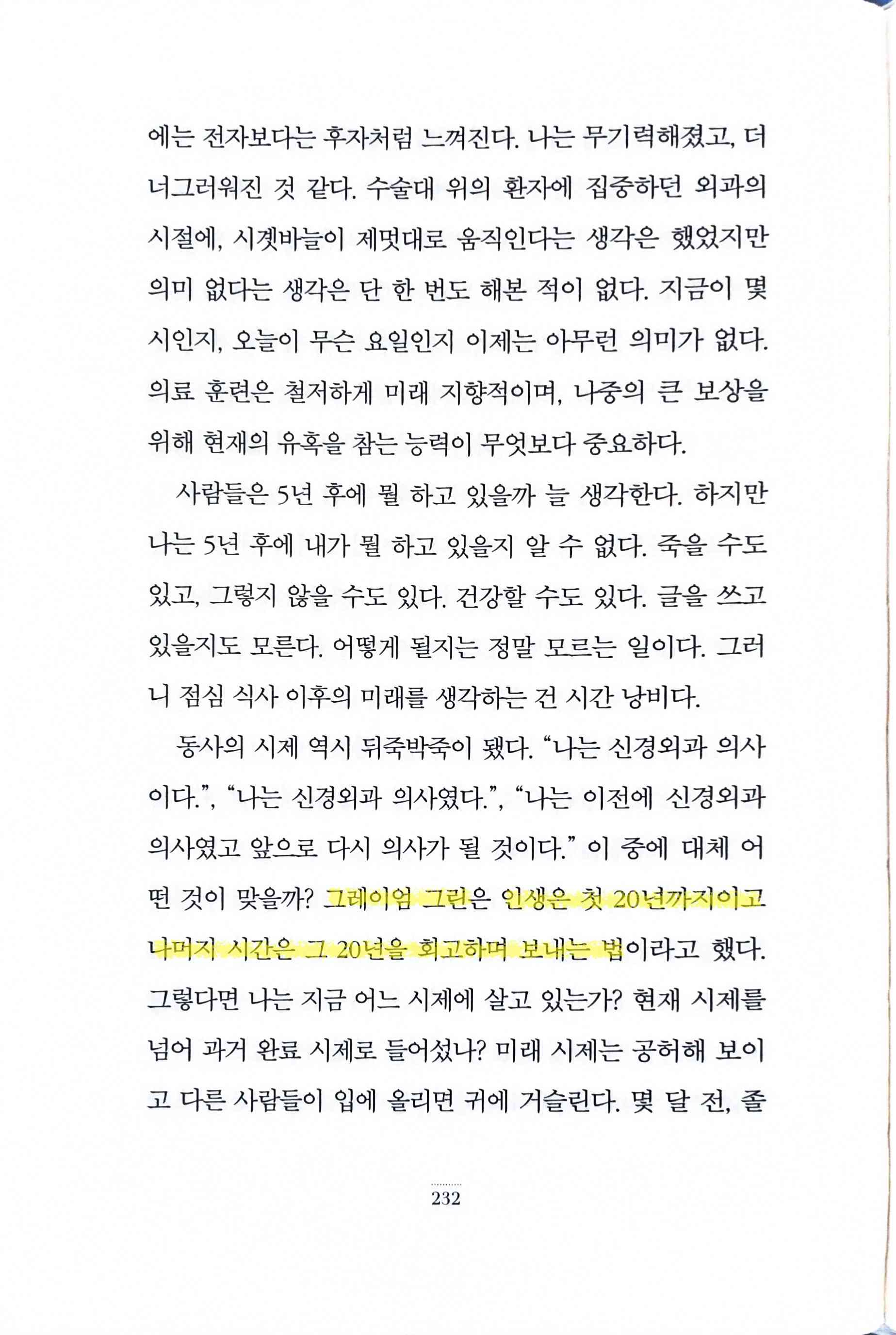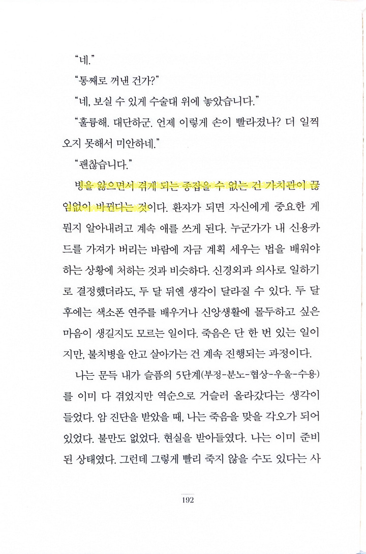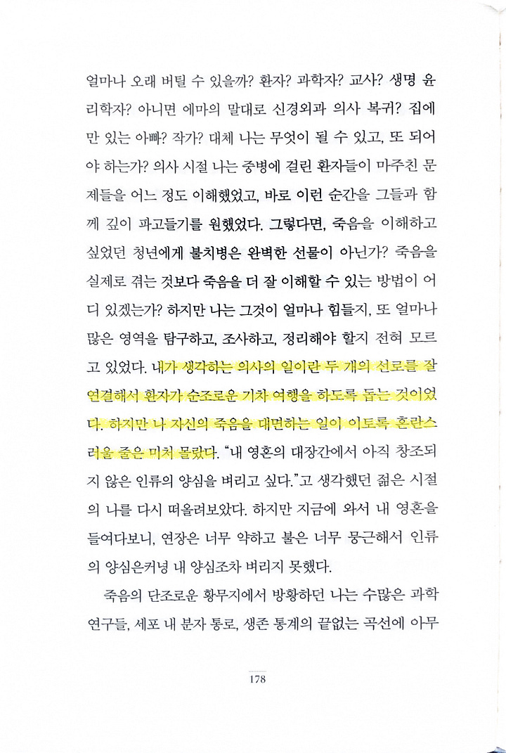 어렸을 때 병원에 3개월 넘게 입원한 경험이 있던 나로서는, 병으로 인해 삶이 송두리째 흔들리는 감정을 아주 약간은 이해할 수 있다. 하지만 성공 직전에서 모든 것이 무너지는 듯한 경험은 상상 속에서만 그려볼 뿐이다. 슬픔의 5단계에서 "체념"과 "수용"에 이르는 것이 얼마나 어려운 과정인지는 상상을 해도 가늠하기 힘들다. 저자 역시 그 과정에서 느낀 무력감과 혼란, 손만 뻗으면 닿을 것 같던 성공을 포기해야 했던 아픔을 담담한 문장으로 그려낸다. 의사였던 그는 누구보다도 자신의 몸 상태를 잘 이해했지만, 역설적으로 바로 그 지식이 자신의 상황을 더 뼈아프게 만들었을지도 모른다.
