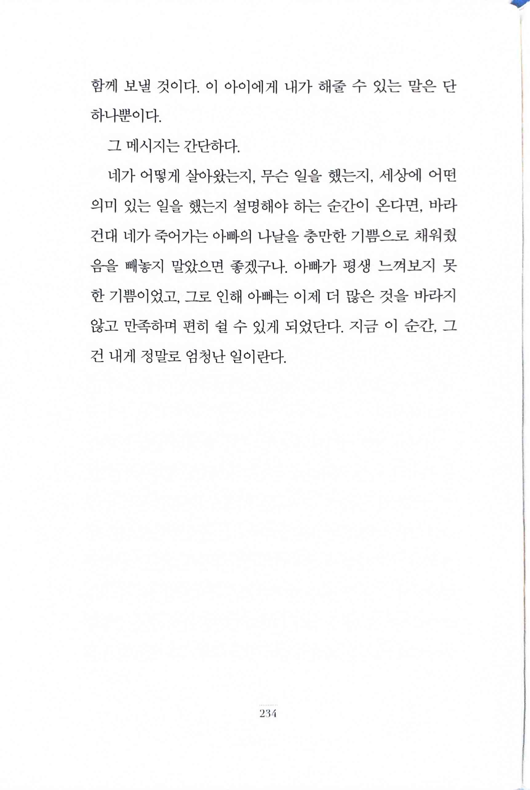 p234 아이를 가진 부모가 아니면 쉽게 이해하기 어려울 감정이다. 다만 죽음을 앞둔 상황에서는 얼마나 극적이었을지 상상이 가지 않는다.