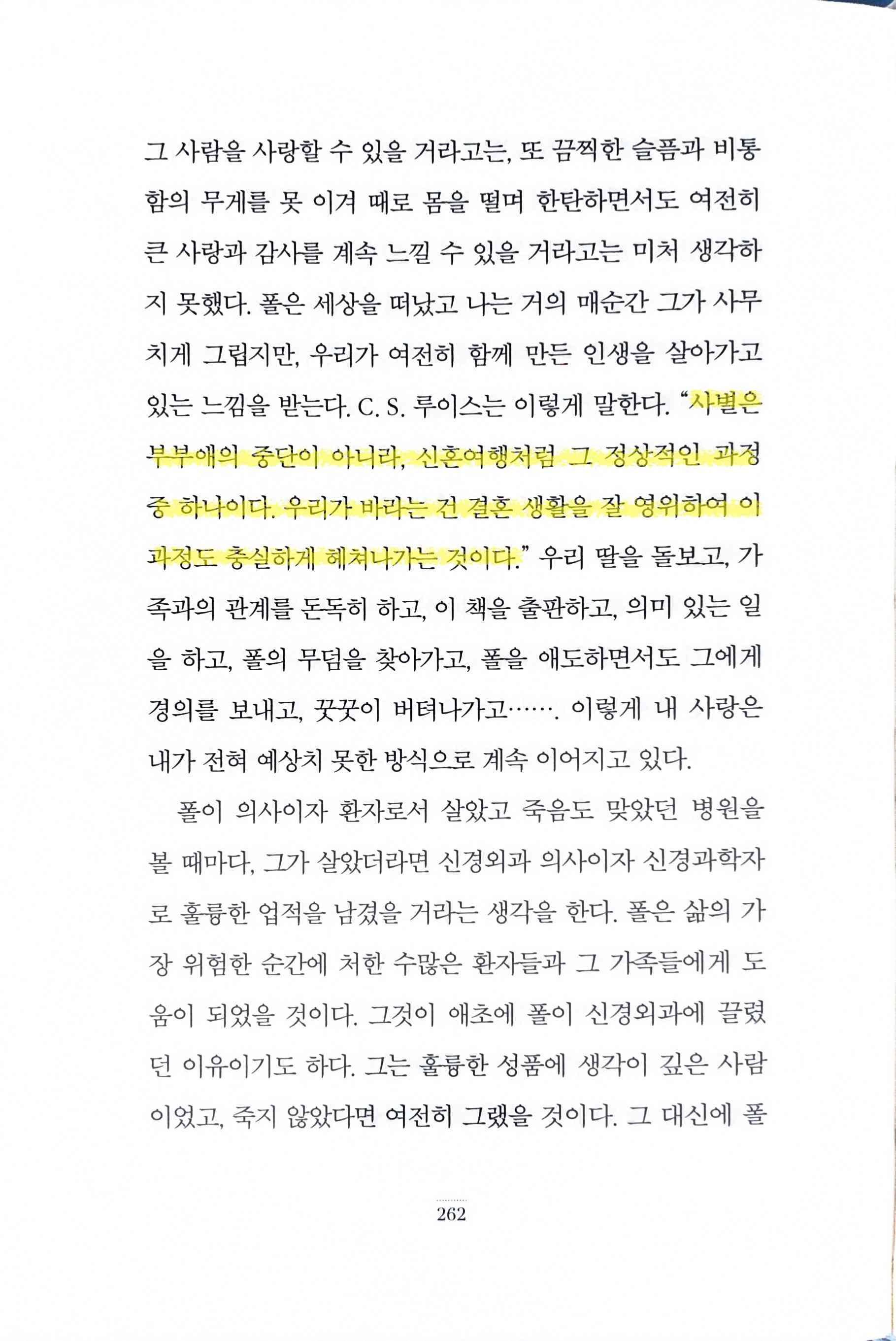 하지만 그는 끝까지 살아가기로 결심했다. 아내와 함께 아이를 갖기로 결정하고, 죽기 얼마 전 딸을 만나게 되는 기쁨을 통해 그는 새로운 의미를 찾았다. 그리고 마지막까지 자신의 경험과 생각을 글로 기록하며 자신의 삶을 완성해 나갔다. 그의 글은 단순히 개인적인 투병기를 넘어, 삶과 죽음, 인간의 존재에 대한 고민을 담고 있다.